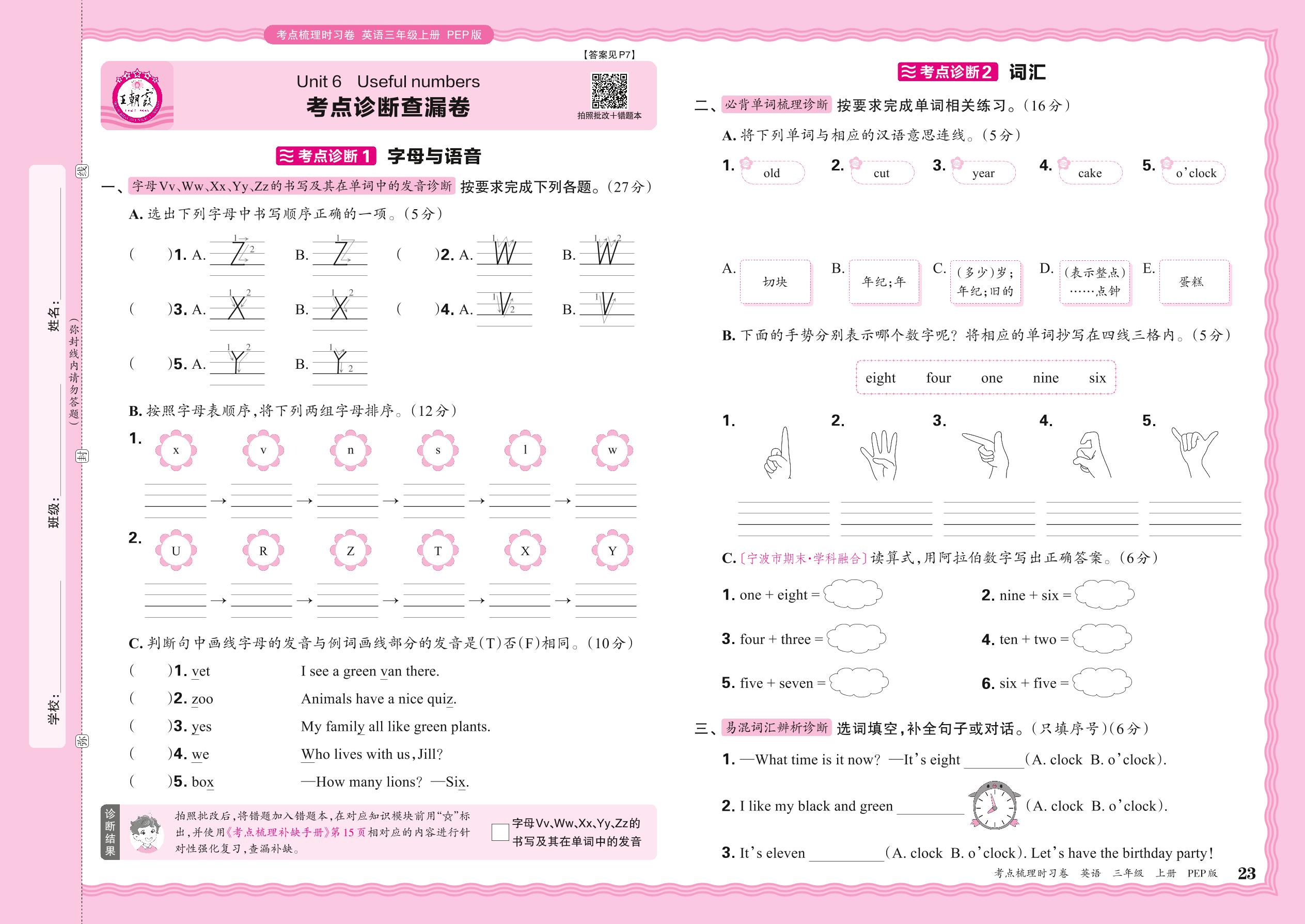 2024秋上册三年级英语人教PEP版(三起始) Unit 6 考点诊断查漏卷