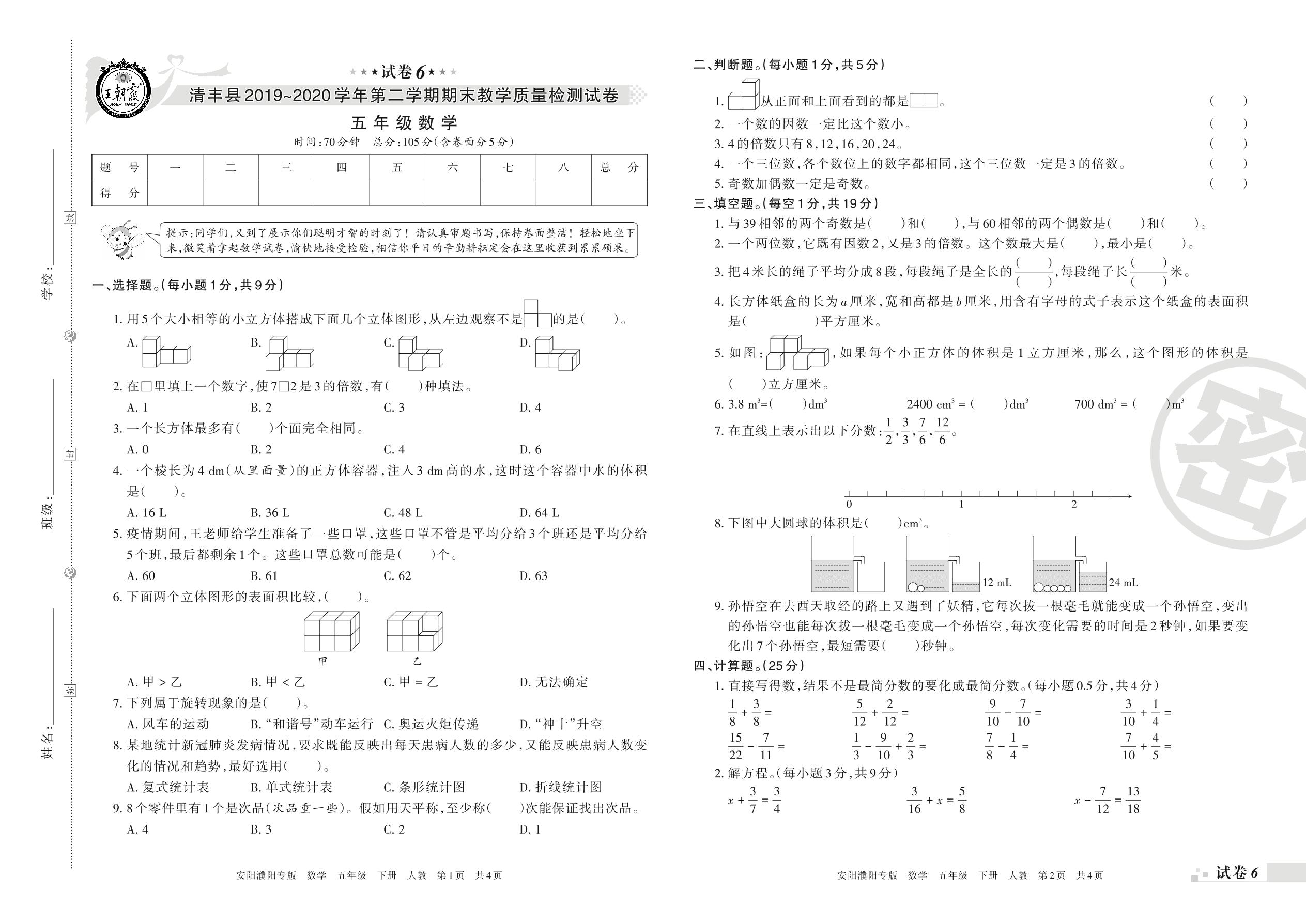 2019-2020学年第二学期濮阳市清丰县五年级数学试卷(人教版)【6】