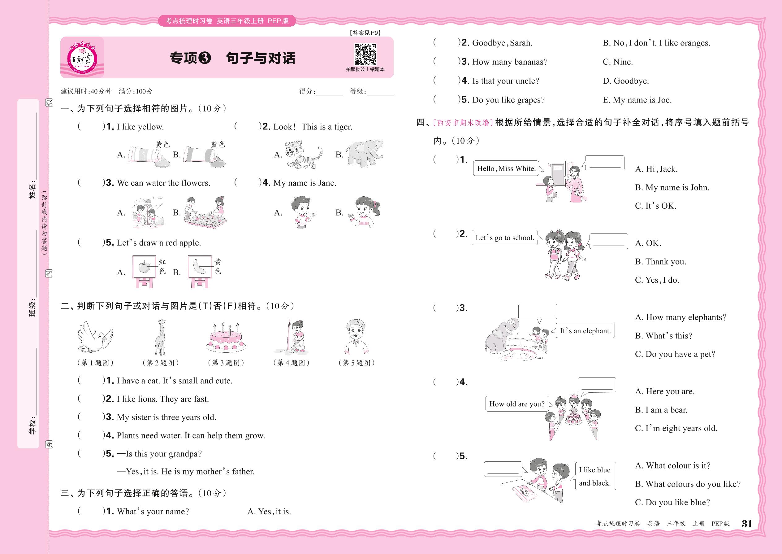 2024秋上册三年级英语人教PEP版(三起始) 期末专项卷KD版·句子与对话【3】