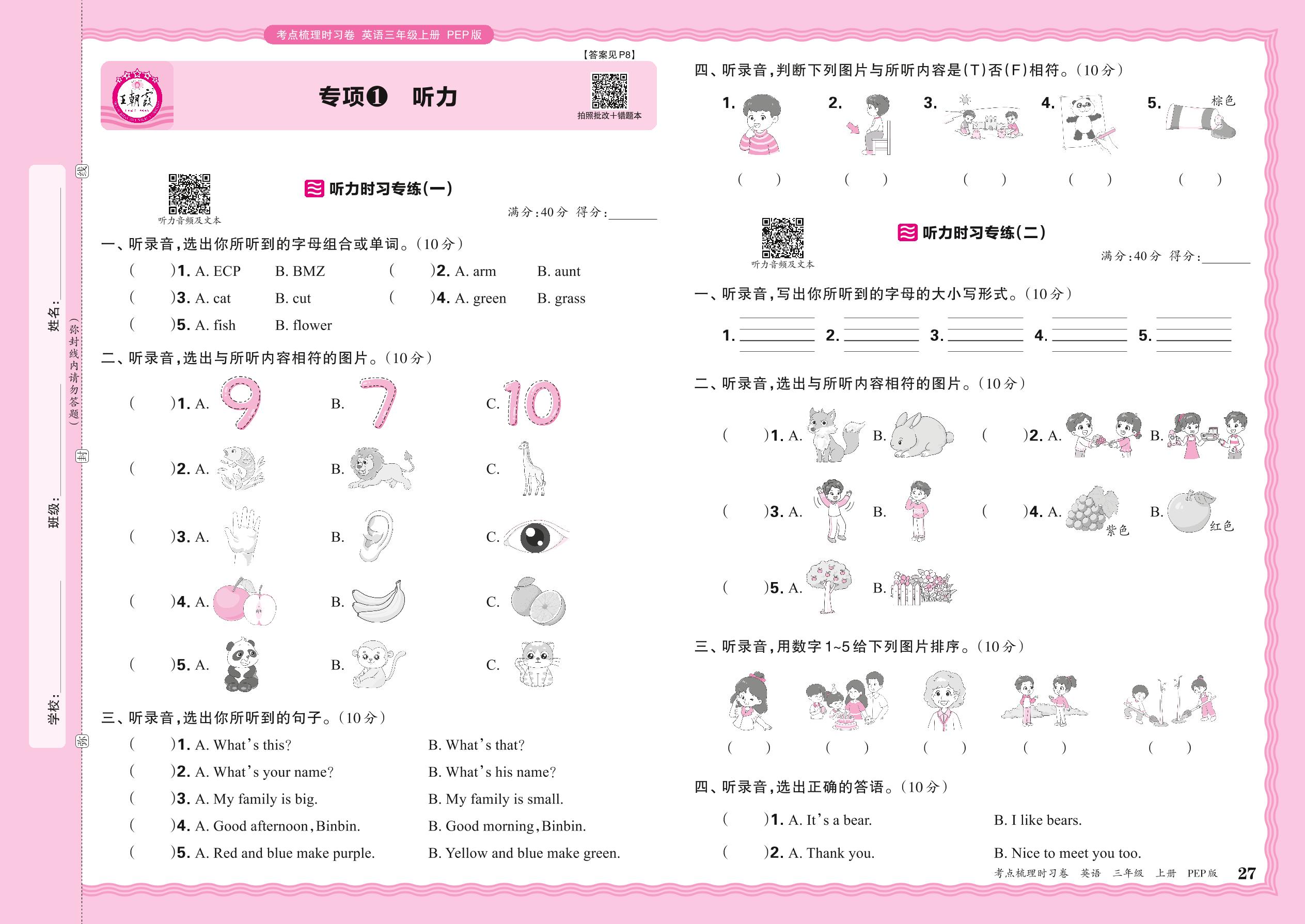 三年级英语人教PEP版(三起始)(2024)上册专项卷