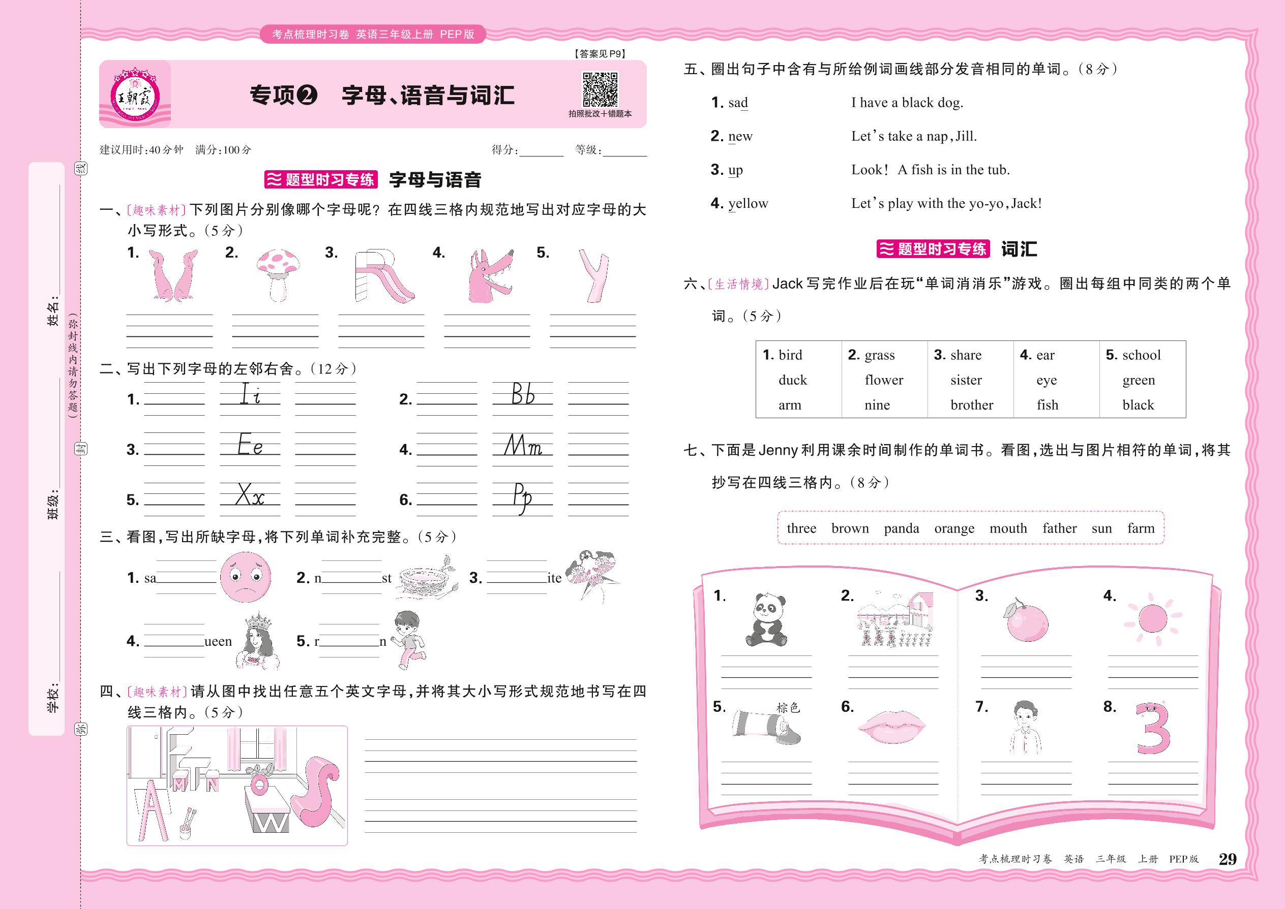 2024秋上册三年级英语人教PEP版(三起始) 期末专项卷KD版·字母、语音与词汇【2】