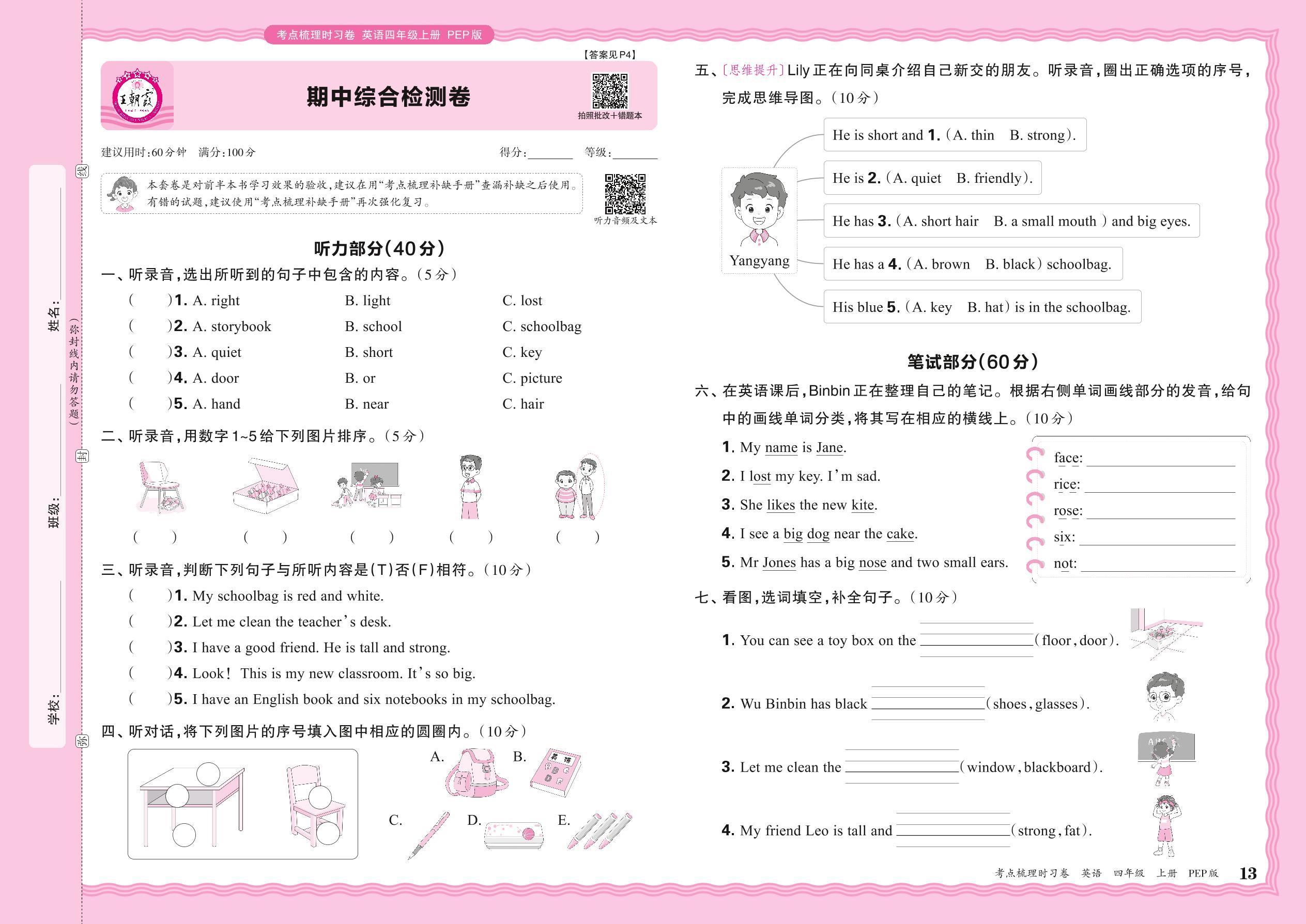 2024秋上册四年级英语人教PEP版(三起始) 期中综合检测卷