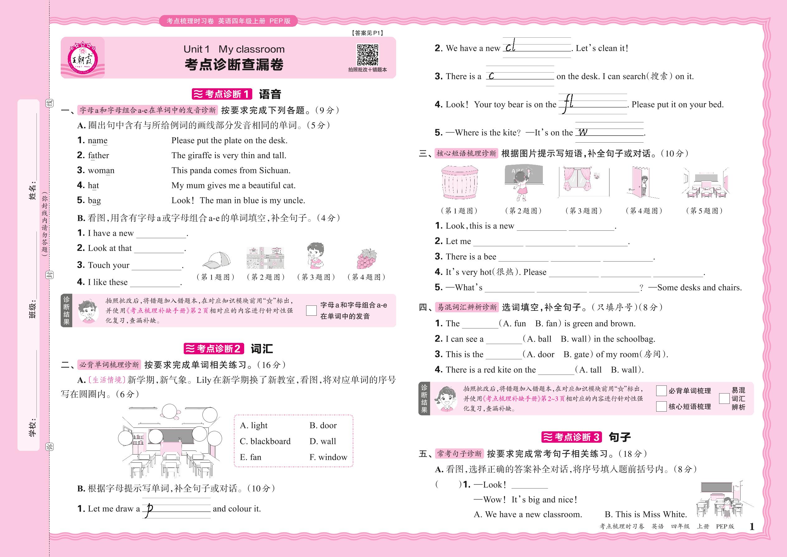 2024秋上册四年级英语人教PEP版(三起始) Unit 1 考点诊断查漏卷