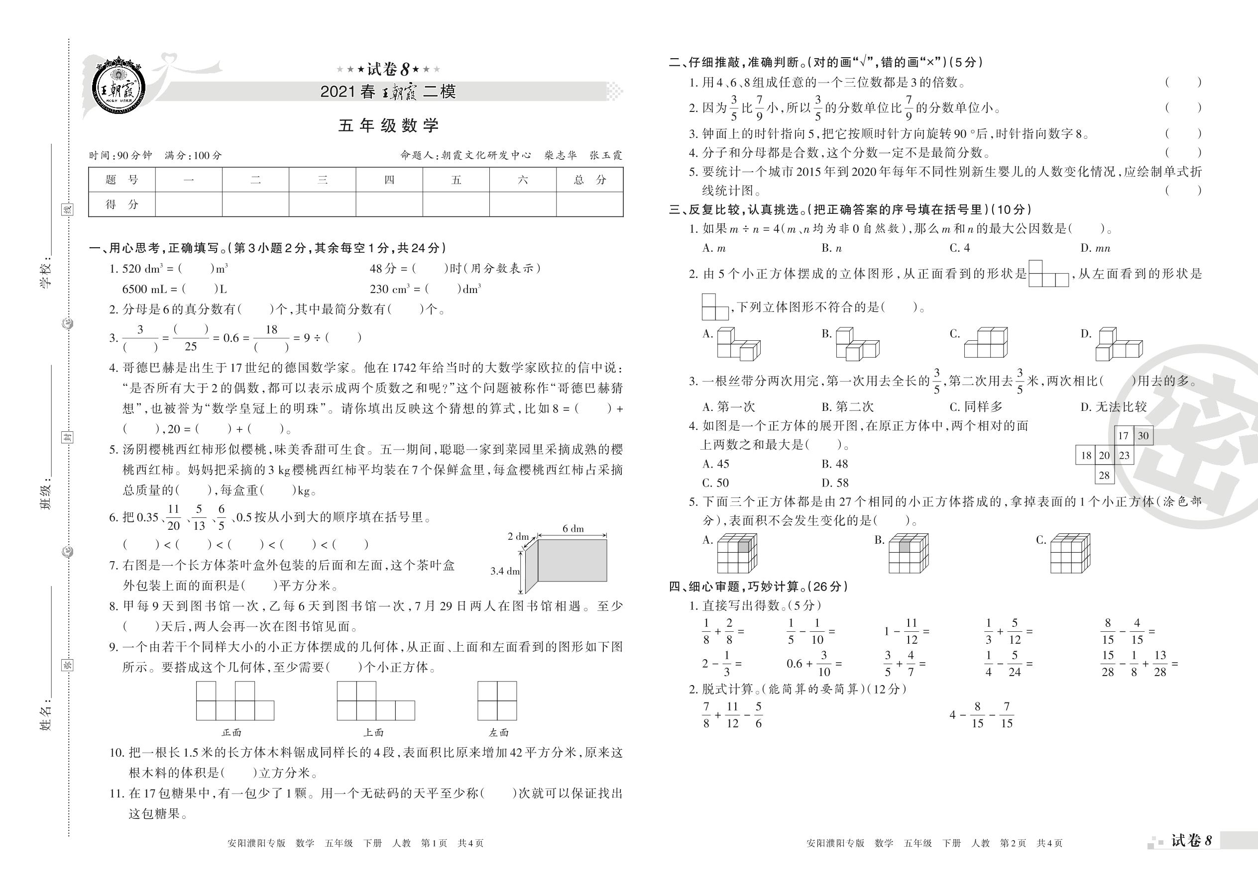 王朝霞期末模拟卷五年级下册数学(人教版)_R210804162227【8】