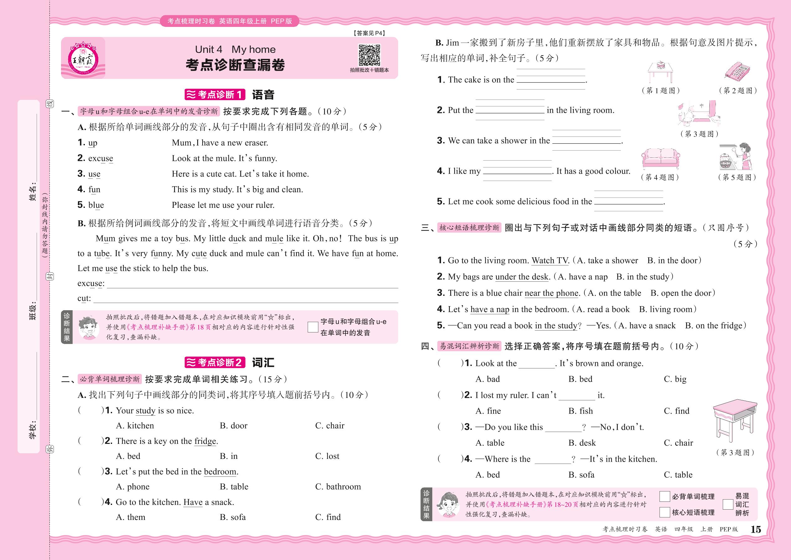 2024秋上册四年级英语人教PEP版(三起始) Unit 4 考点诊断查漏卷