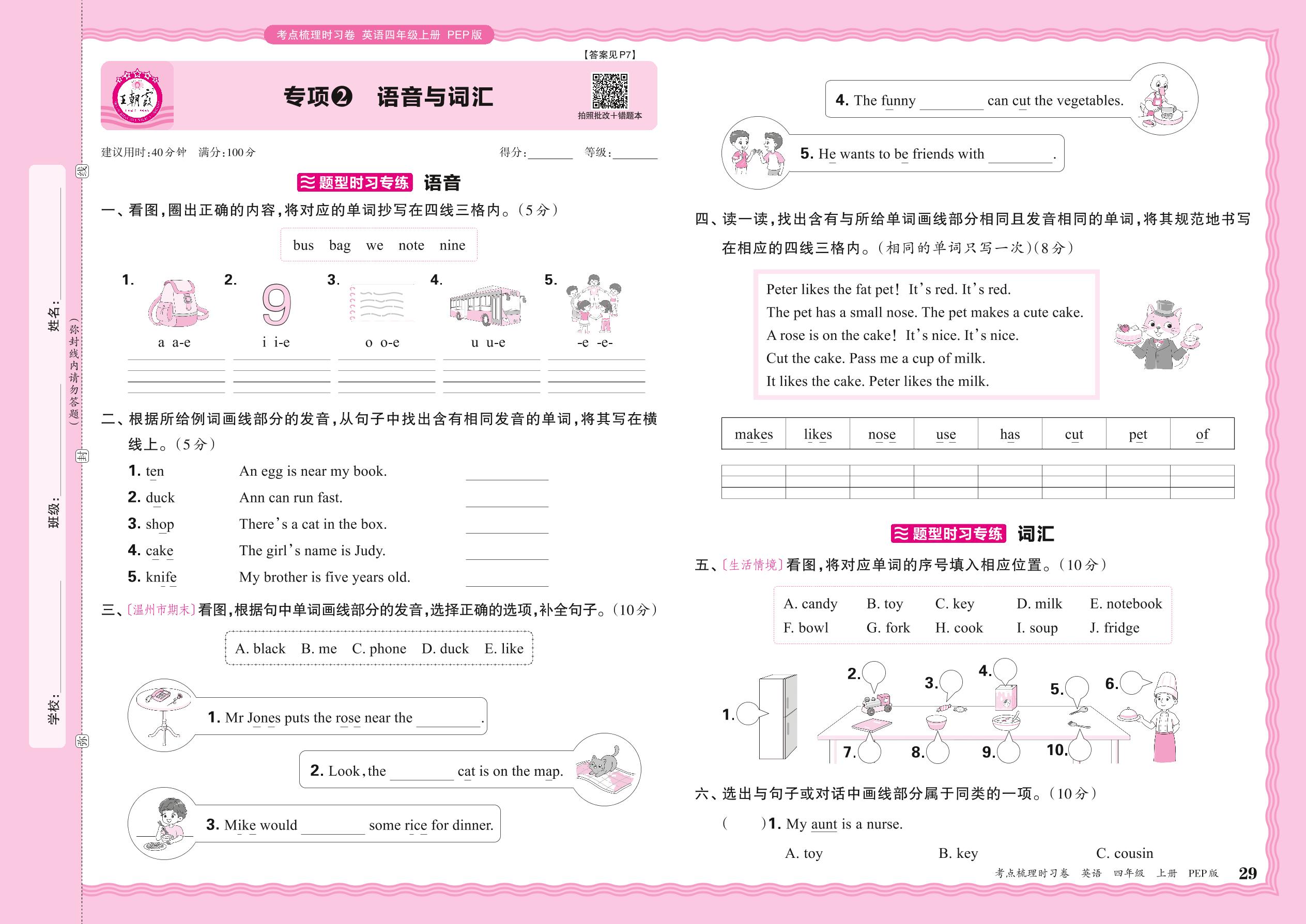 2024秋上册四年级英语人教PEP版(三起始) 期末专项卷KD版·语音与词汇【2】