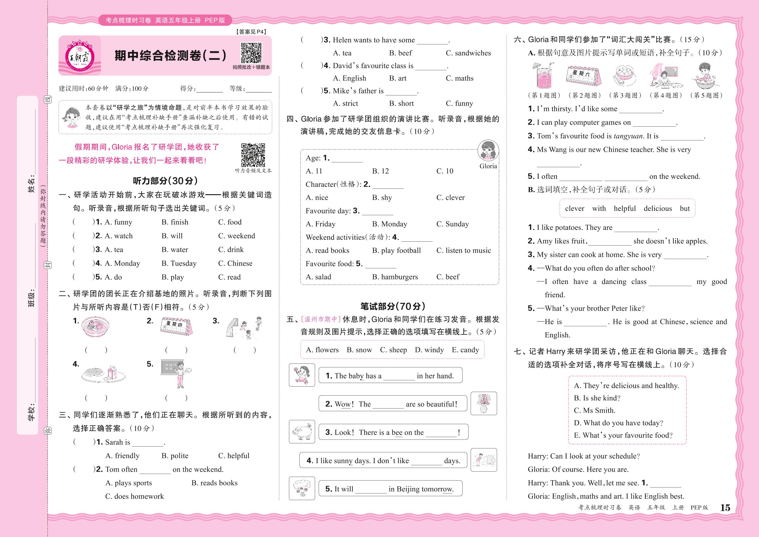 2024秋上册五年级英语人教PEP版(三起始) 期中综合检测卷(二)