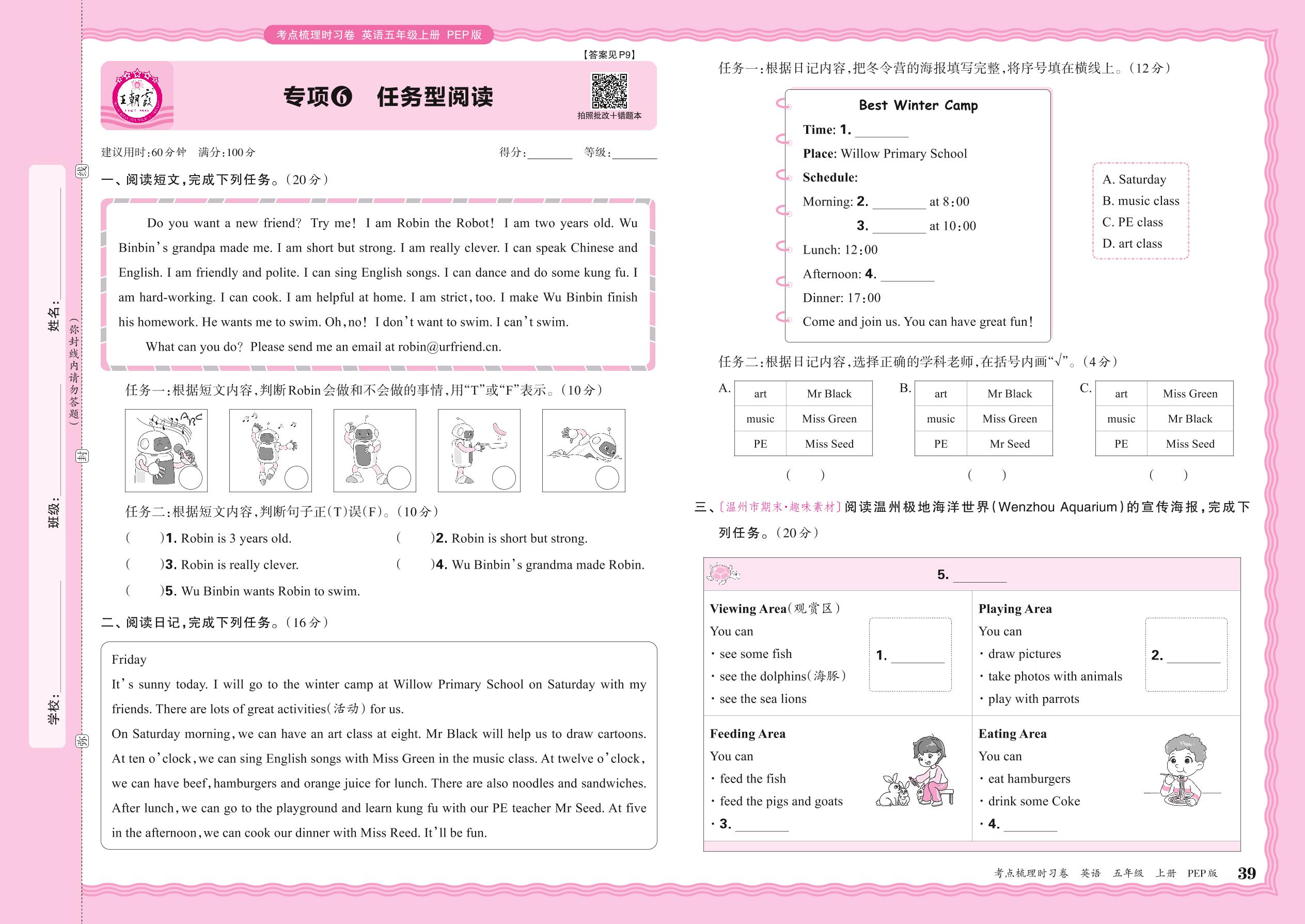 2024秋上册五年级英语人教PEP版(三起始) 期末专项卷KD版·任务型阅读【6】