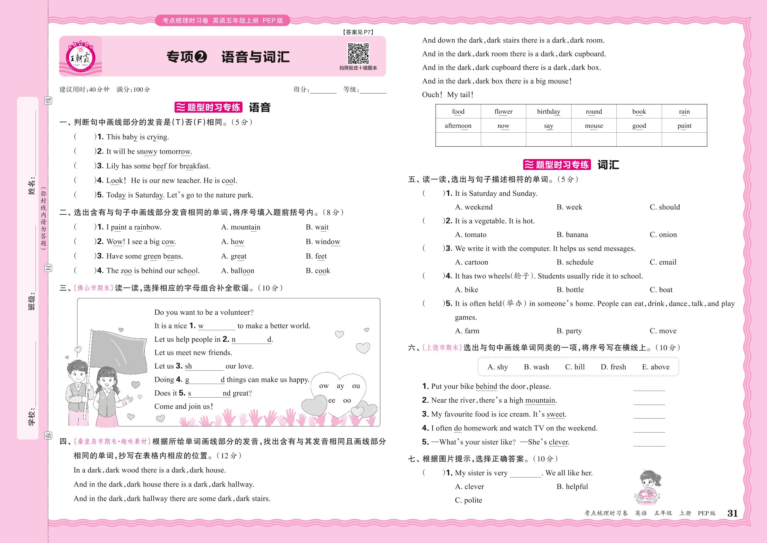 2024秋上册五年级英语人教PEP版(三起始) 期末专项卷KD版·语音与词汇【2】