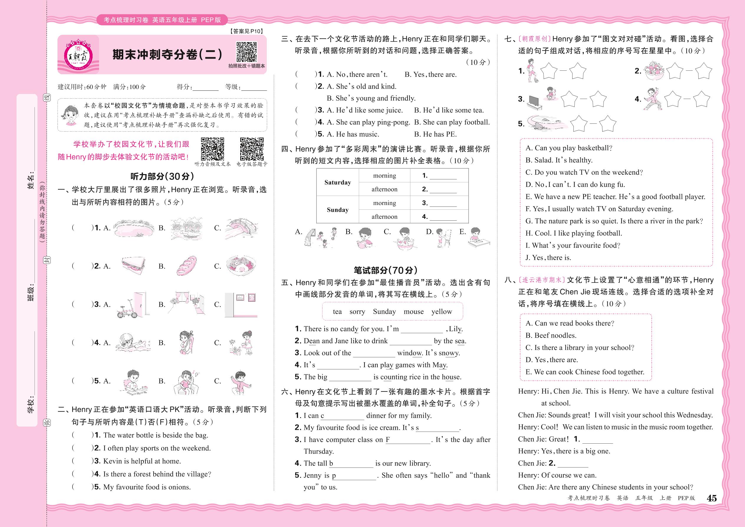 五年级英语人教PEP版(三起始)上册期末卷