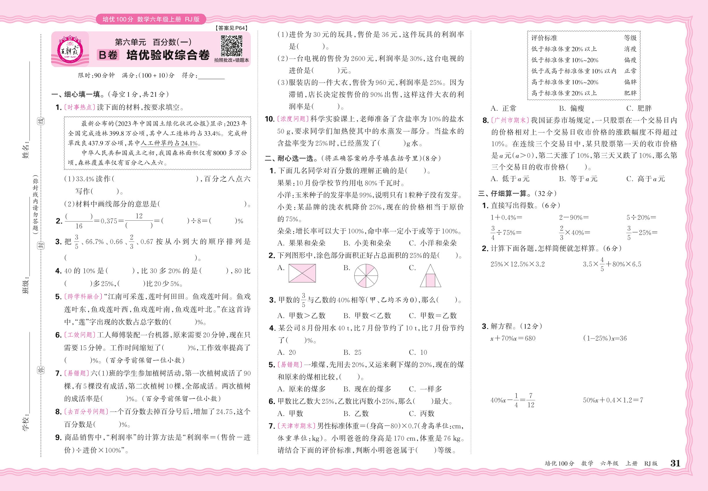 2024秋上册六年级数学人教版 第六单元B卷 培优验收综合卷