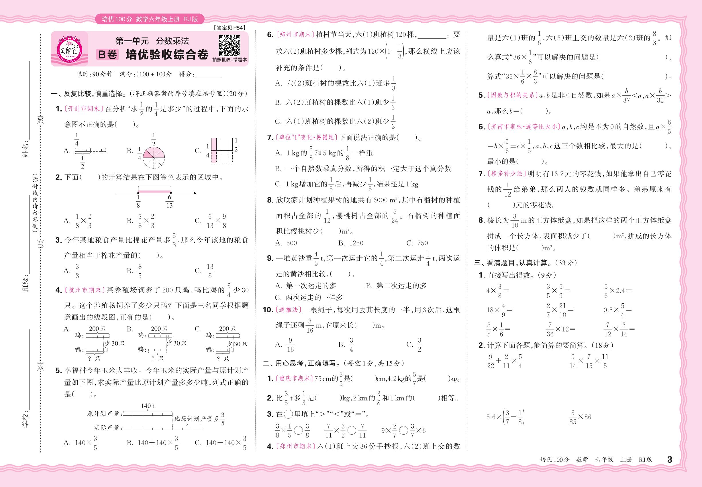 2024秋上册六年级数学人教版 第一单元B卷 培优验收综合卷