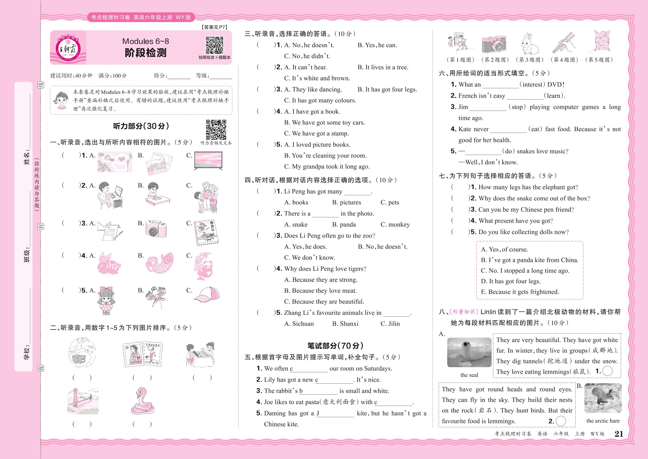 2024秋上册六年级英语外研版(三起始) Module 6~8 阶段检测