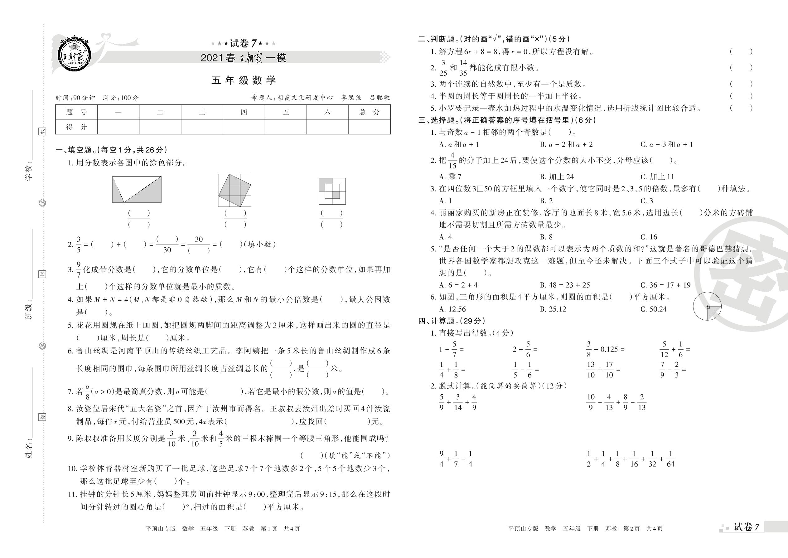 王朝霞期末模拟卷五年级下册数学(苏教版)_R210804162321【7】