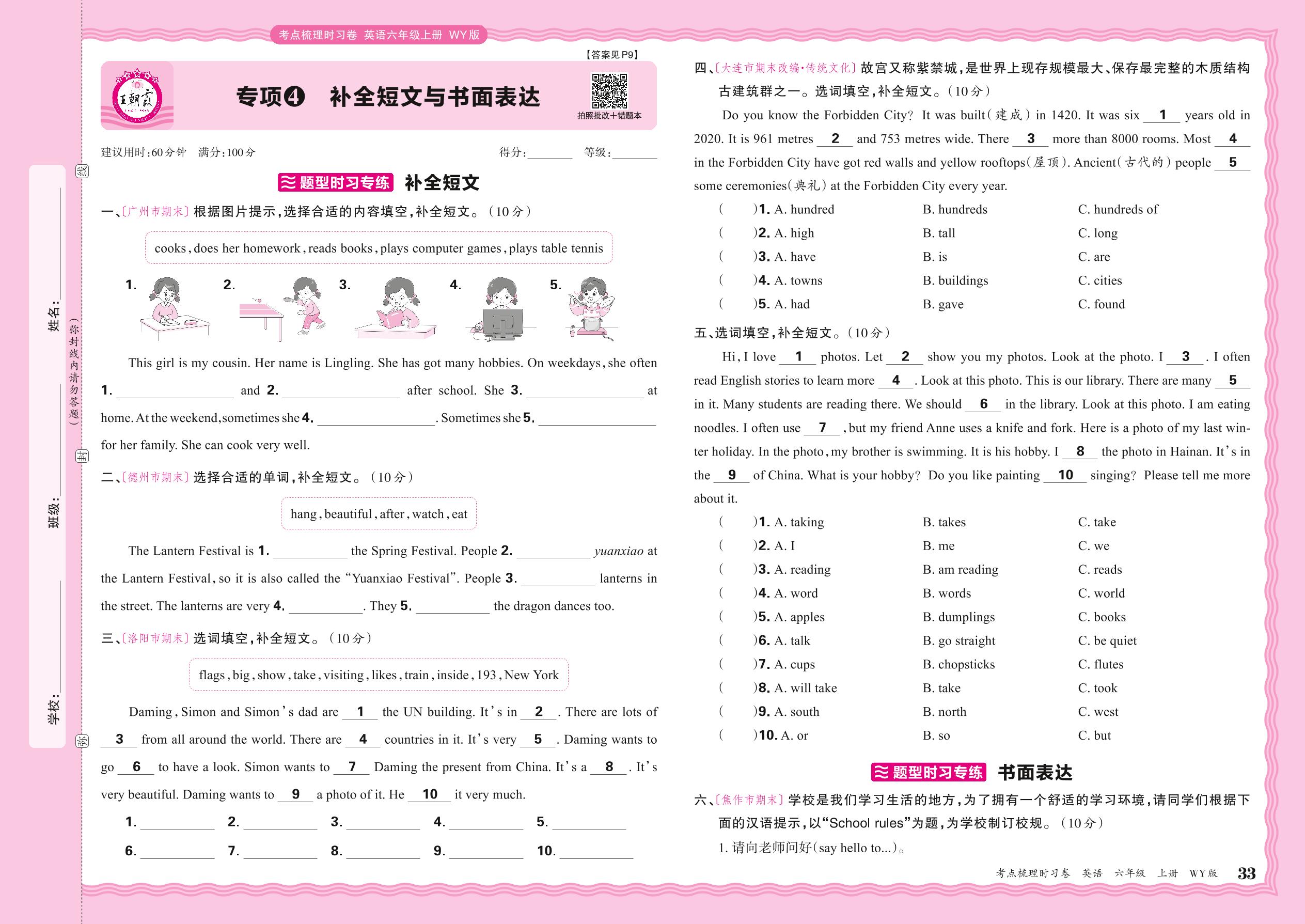 2024秋上册六年级英语外研版(三起始) 期末专项卷KD版·补全短文与书面表达【4】
