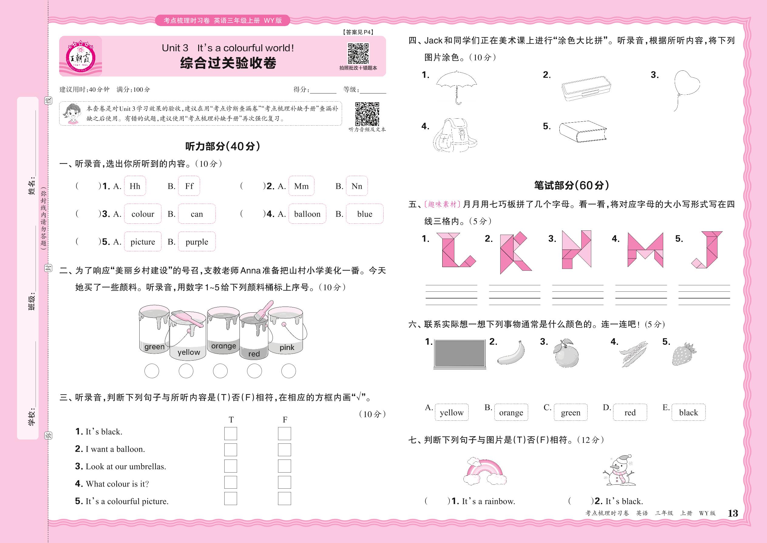 2024秋上册三年级英语外研版(三起始) Unit 3 综合过关验收卷