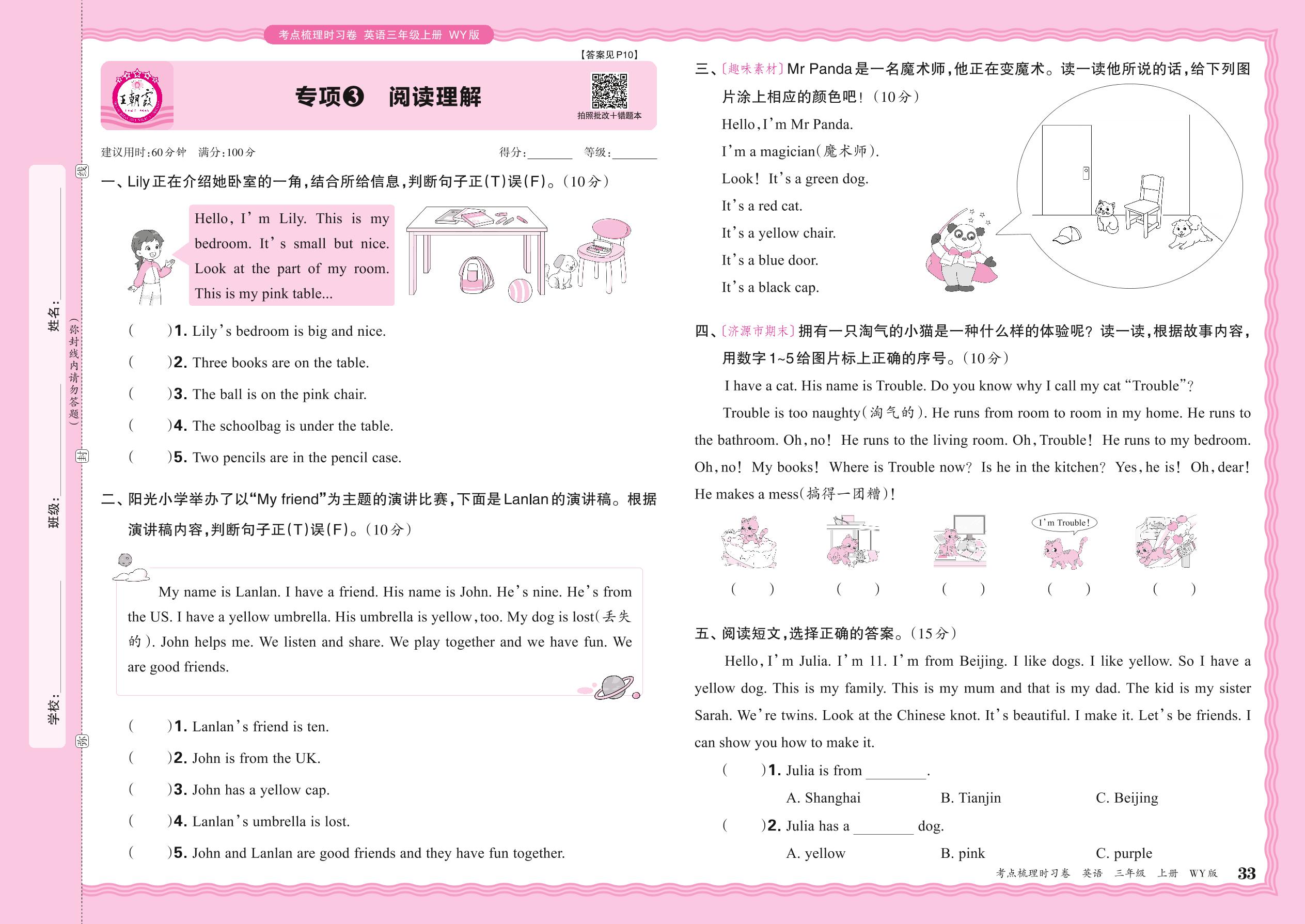 2024秋上册三年级英语外研版(三起始) 期末专项卷KD版·阅读理解【3】