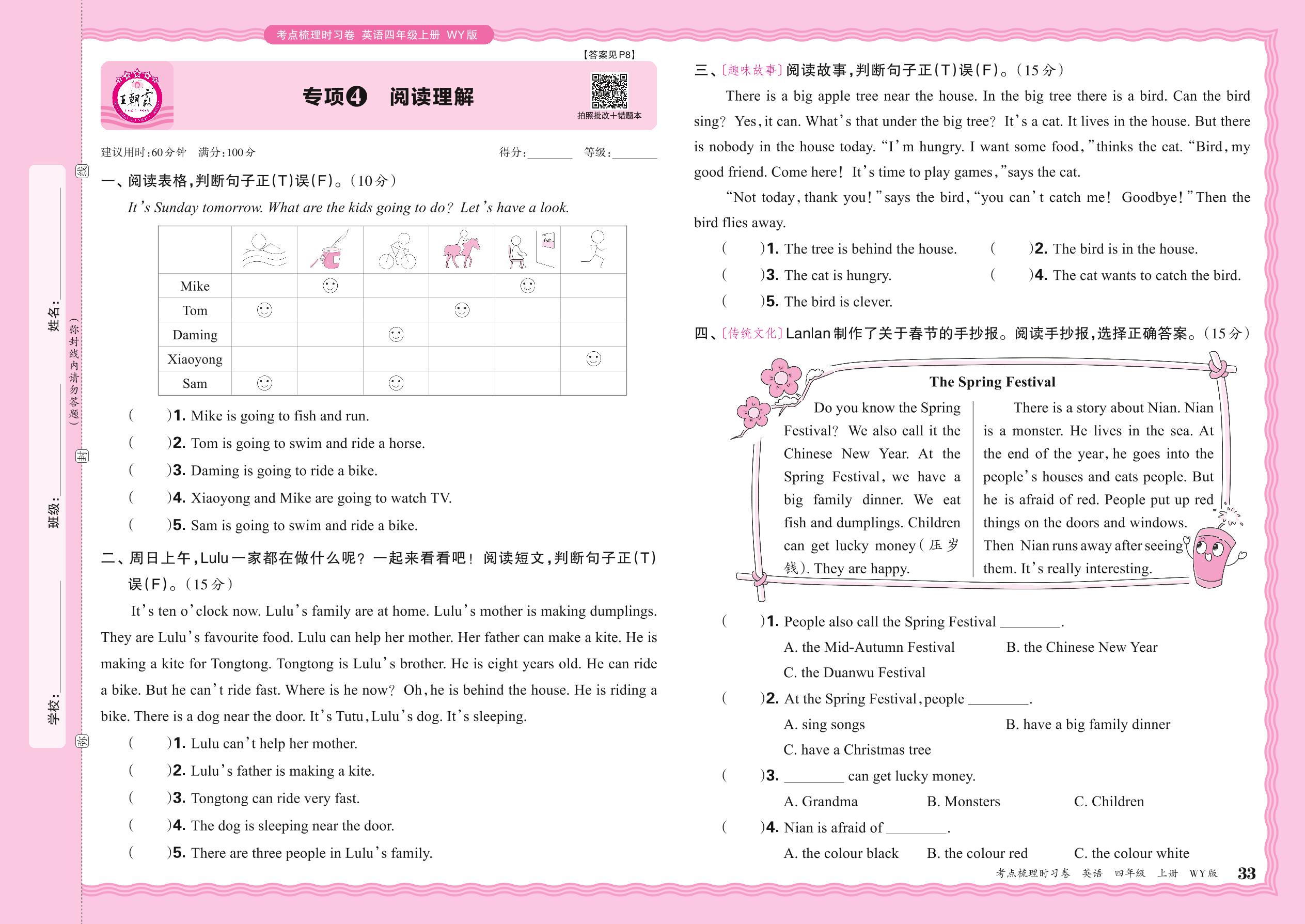 2024秋上册四年级英语外研版(三起始) 期末专项卷KD版·阅读理解【4】