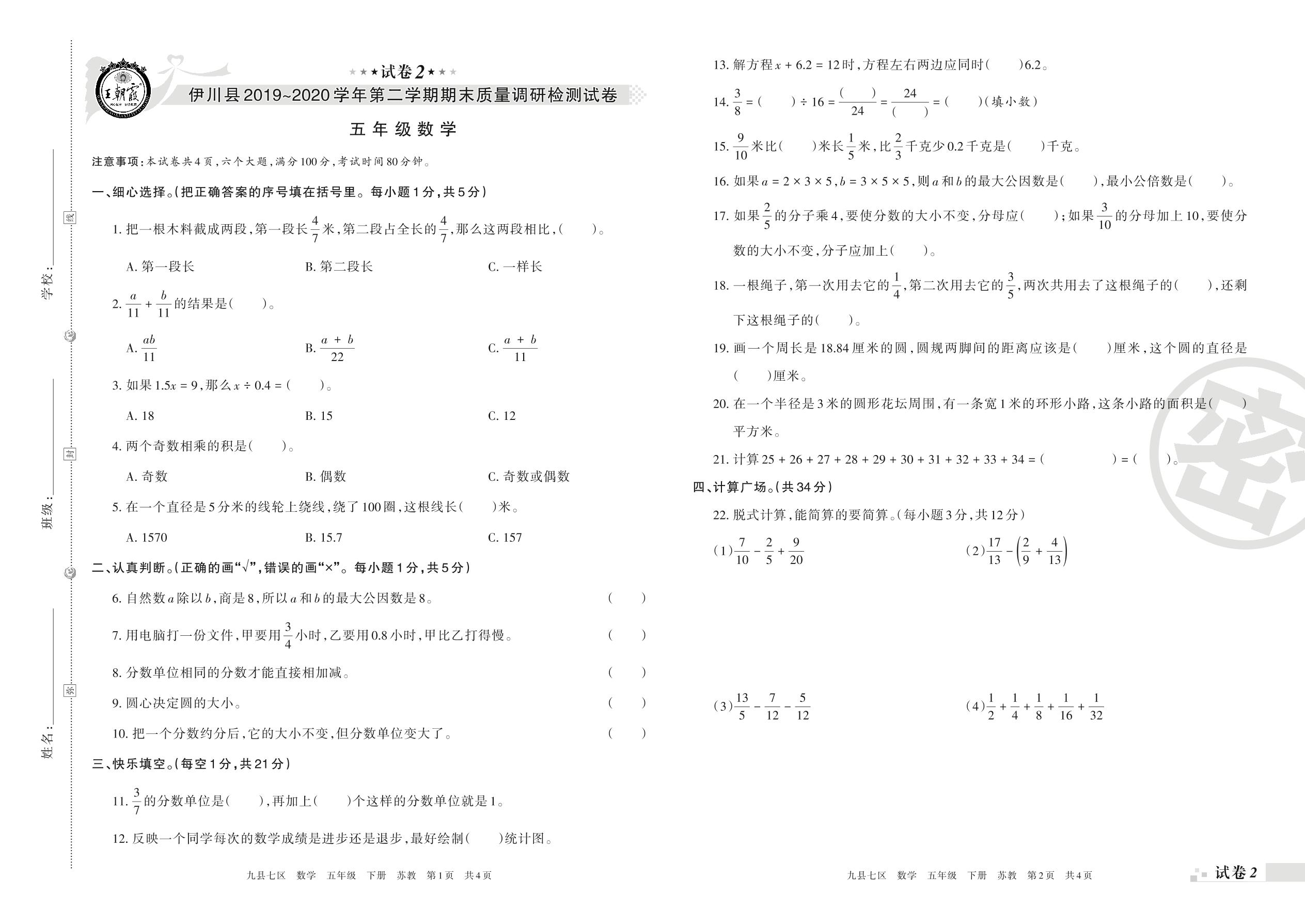 2019-2020学年第二学期洛阳市伊川县五年级数学试卷(苏教版)【2】