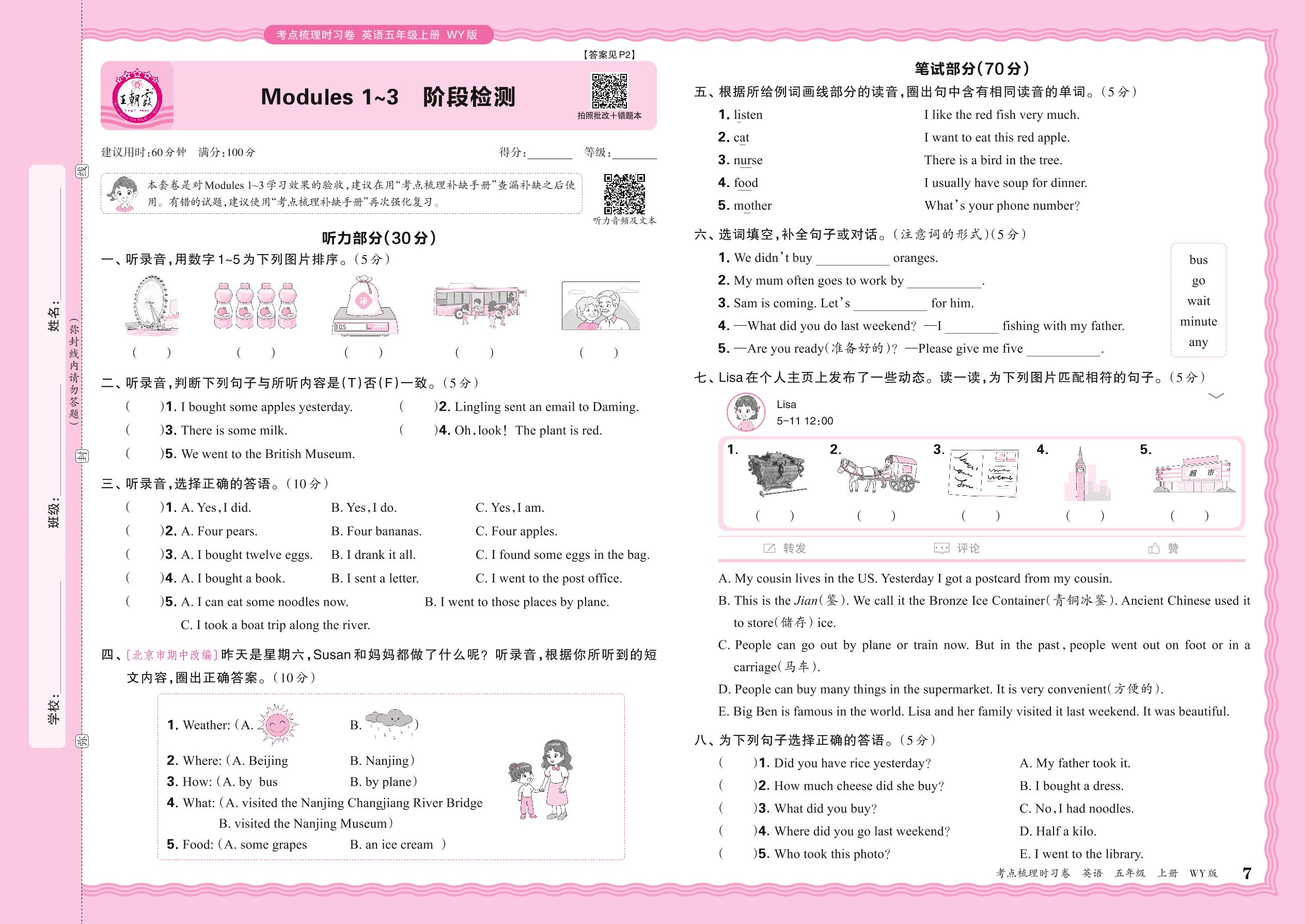 2024秋上册五年级英语外研版(三起始) Module 1~3 阶段检测