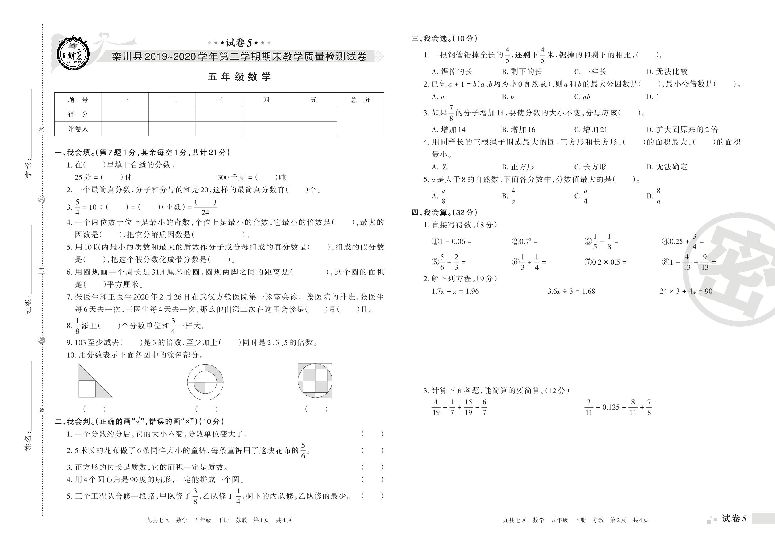 2019-2020学年第二学期洛阳市栾川县五年级数学试卷(苏教版)【5】