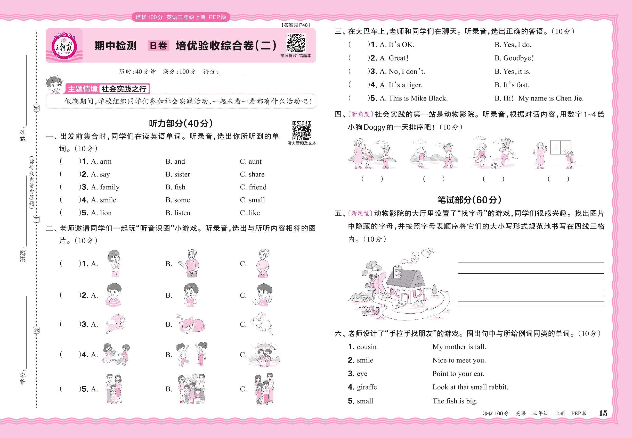 2024秋上册三年级英语人教PEP版(三起始) 期中检测B卷 培优验收综合卷(二)