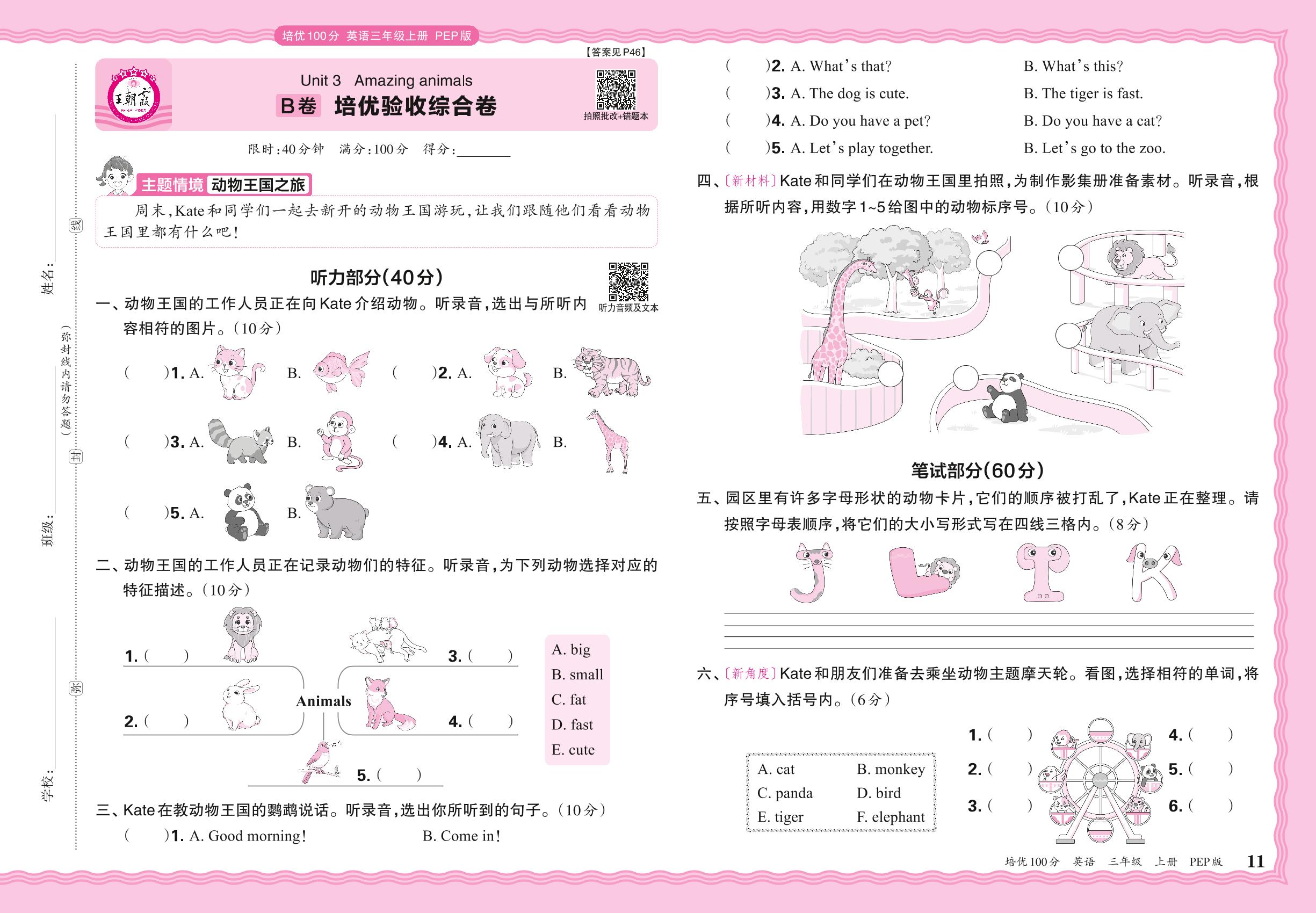 2024秋上册三年级英语人教PEP版(三起始) Unit 3 B卷 培优验收综合卷