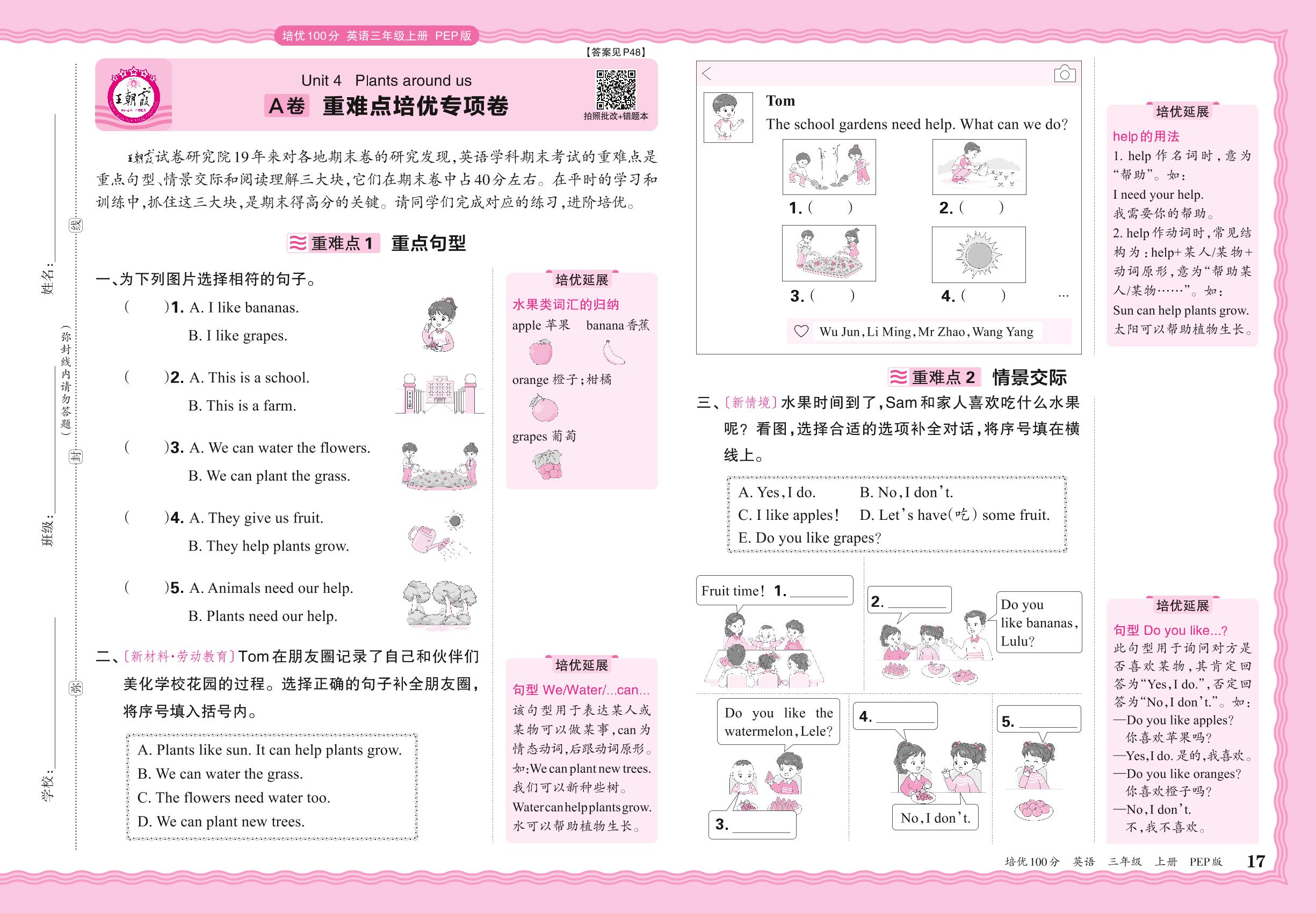 2024秋上册三年级英语人教PEP版(三起始) Unit 4 A卷 重难点培优专项卷