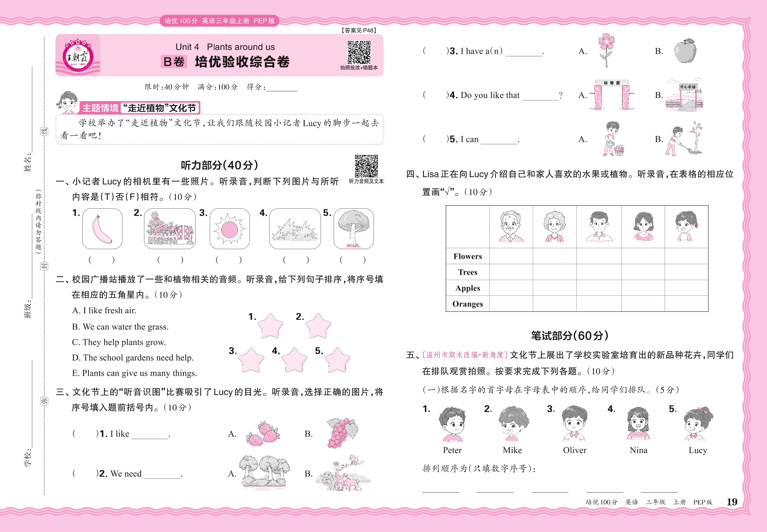 2024秋上册三年级英语人教PEP版(三起始) Unit 4 B卷 培优验收综合卷