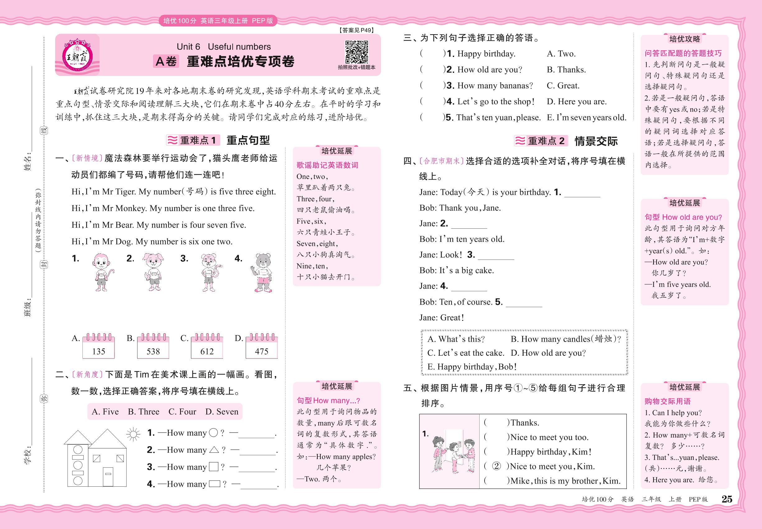 2024秋上册三年级英语人教PEP版(三起始) Unit 6 A卷 重难点培优专项卷