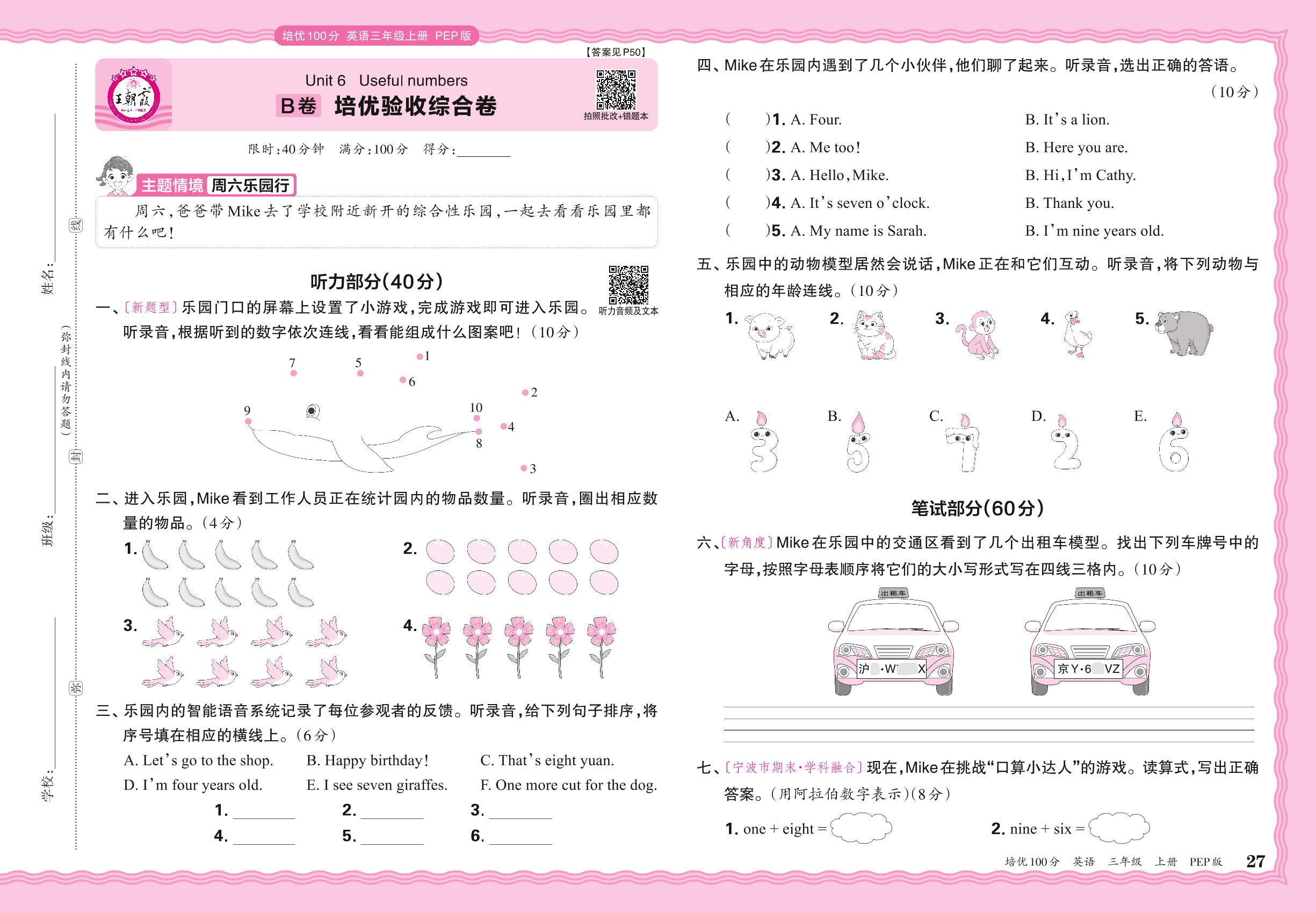 2024秋上册三年级英语人教PEP版(三起始) Unit 6 B卷 培优验收综合卷
