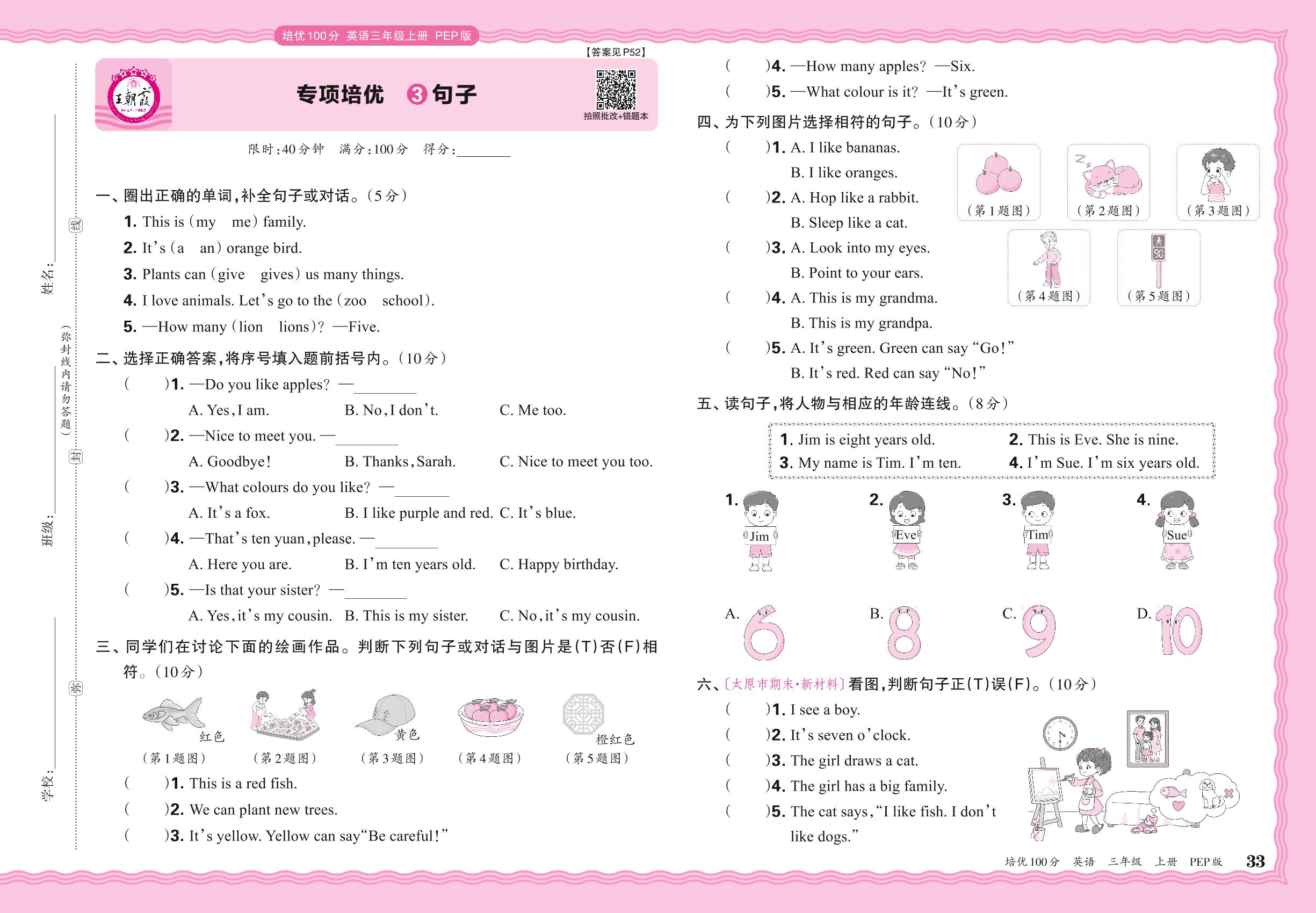 2024秋上册三年级英语人教PEP版(三起始) 期末专项卷PY版·句子【3】