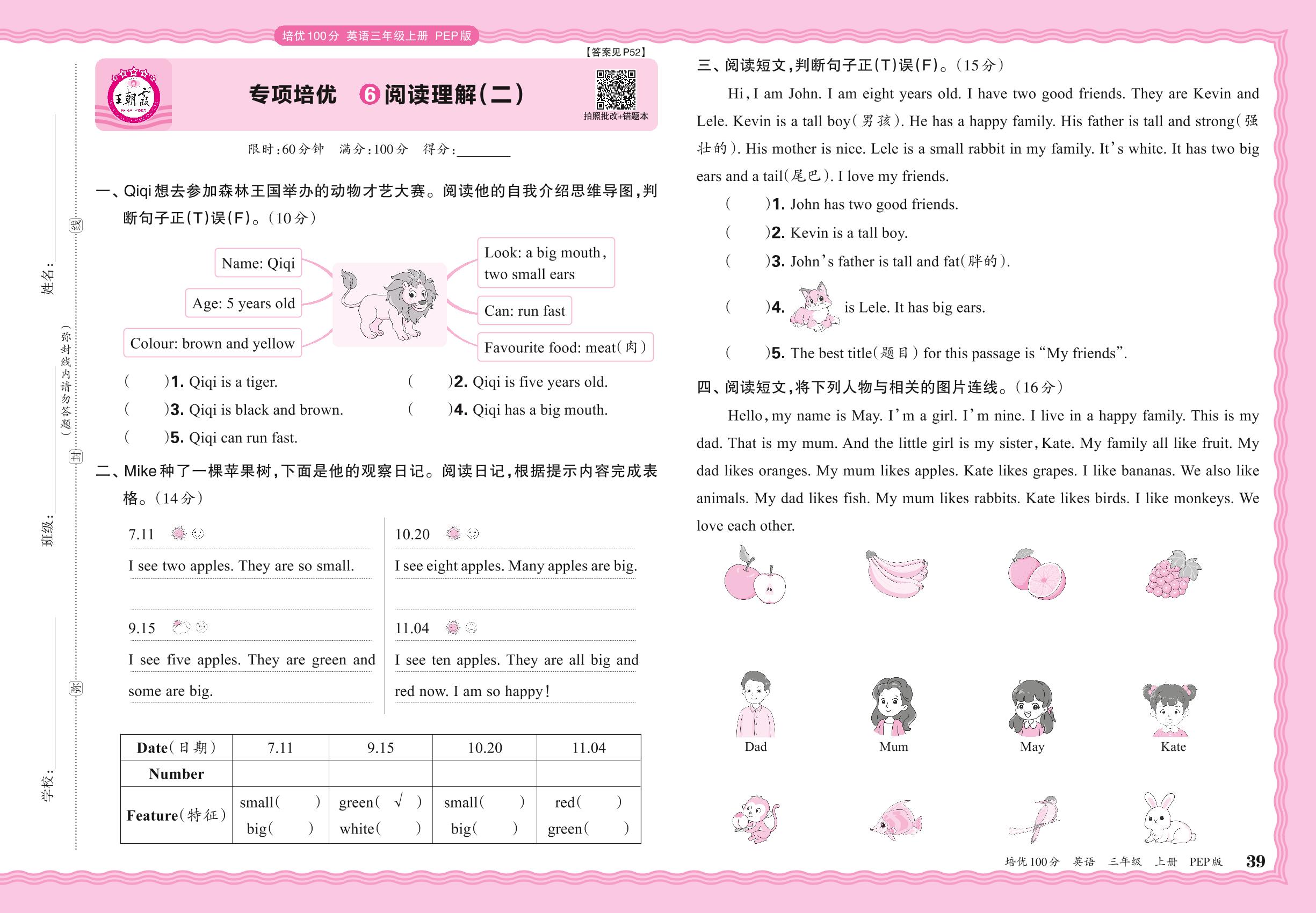 2024秋上册三年级英语人教PEP版(三起始) 期末专项卷PY版·阅读理解(二)【6】