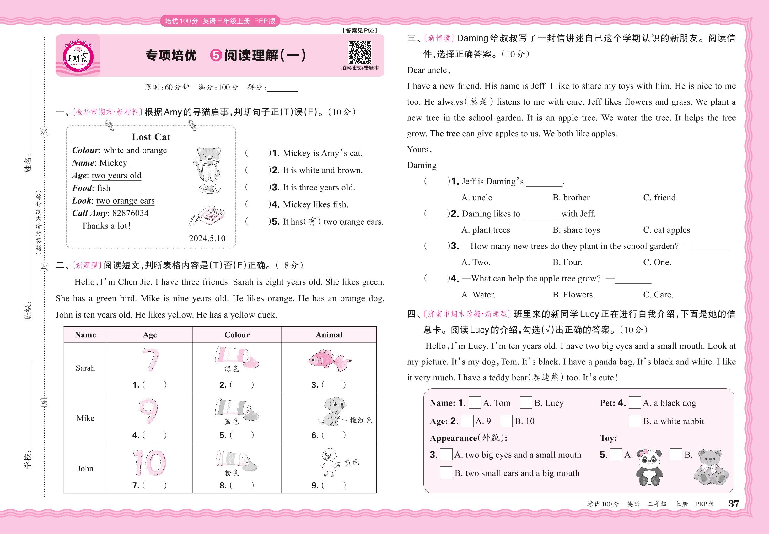 2024秋上册三年级英语人教PEP版(三起始) 期末专项卷PY版·阅读理解(一)【5】
