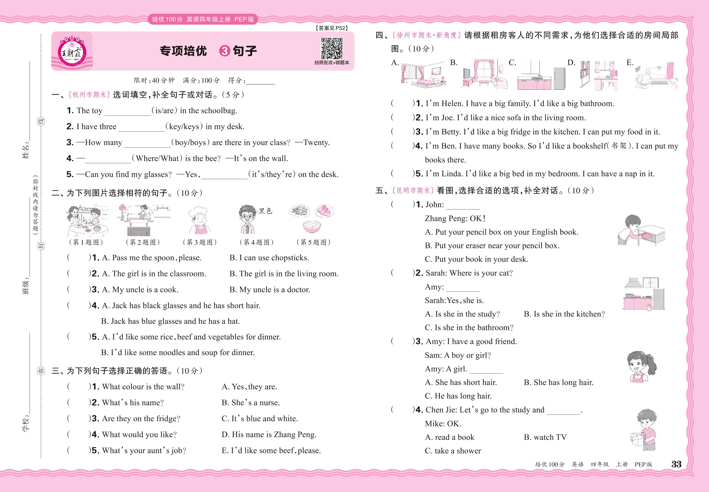 2024秋上册四年级英语人教PEP版(三起始) 期末专项卷PY版·句子【3】