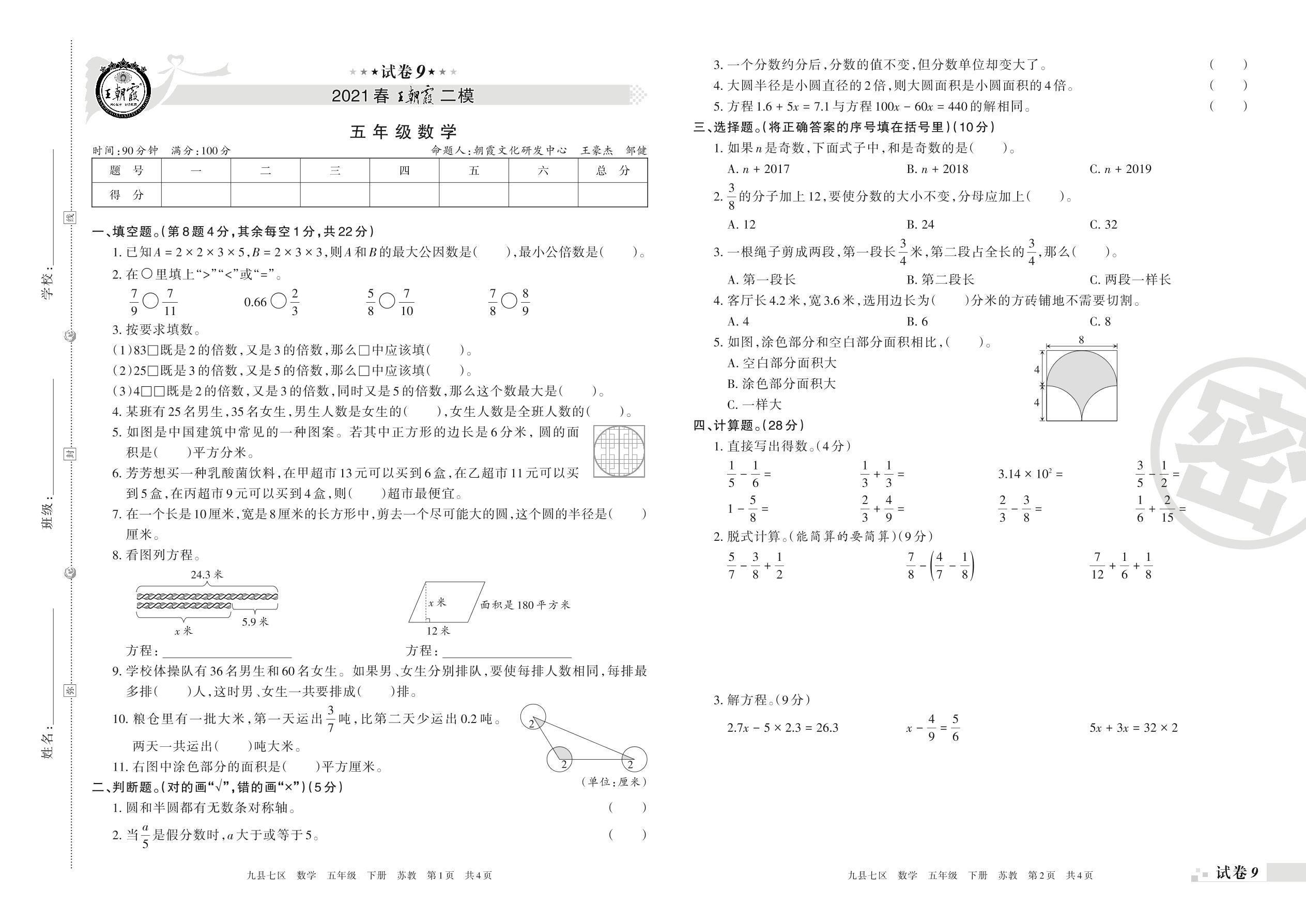 王朝霞期末模拟卷五年级下册数学(苏教版)_R210804162425【9】