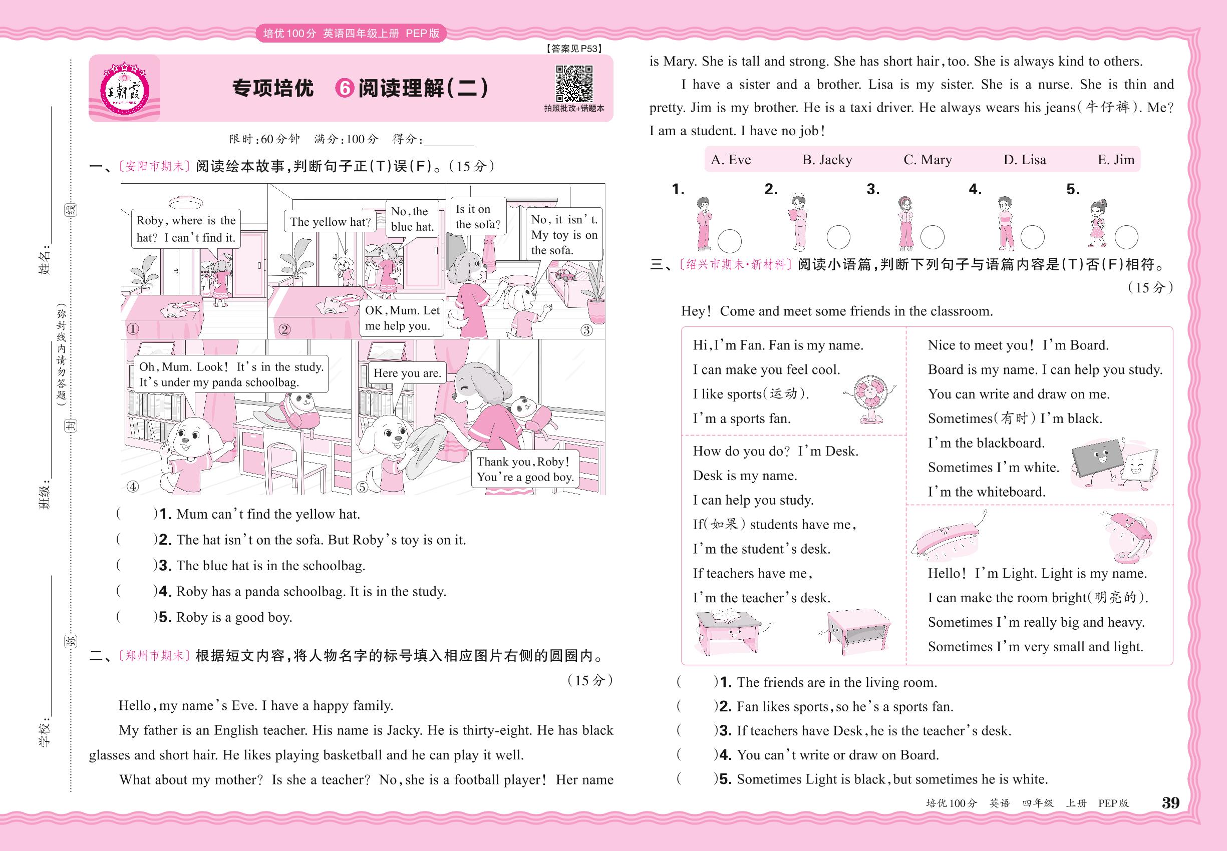 2024秋上册四年级英语人教PEP版(三起始) 期末专项卷PY版·阅读理解(二)【6】