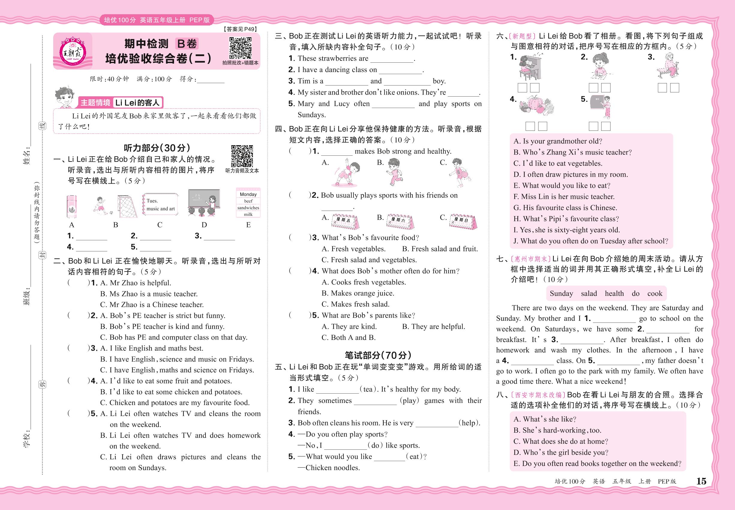 2024秋上册五年级英语人教PEP版(三起始) 期中检测B卷 培优验收综合卷(二)