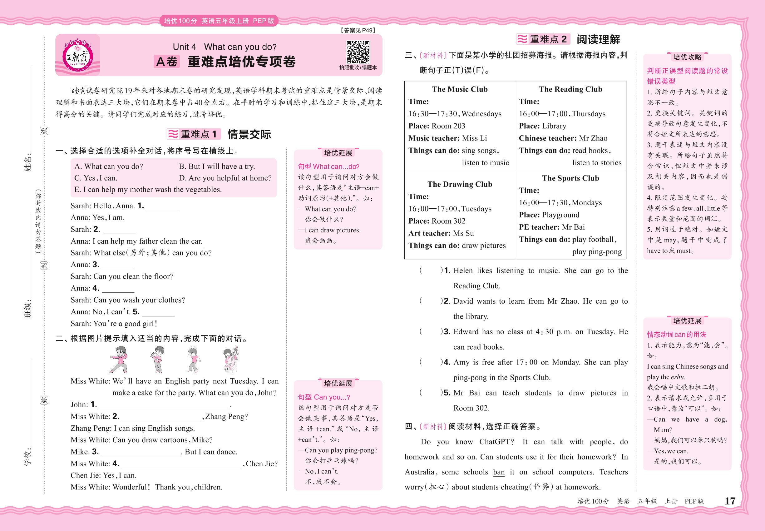 2024秋上册五年级英语人教PEP版(三起始) Unit 4 A卷 重难点培优专项卷