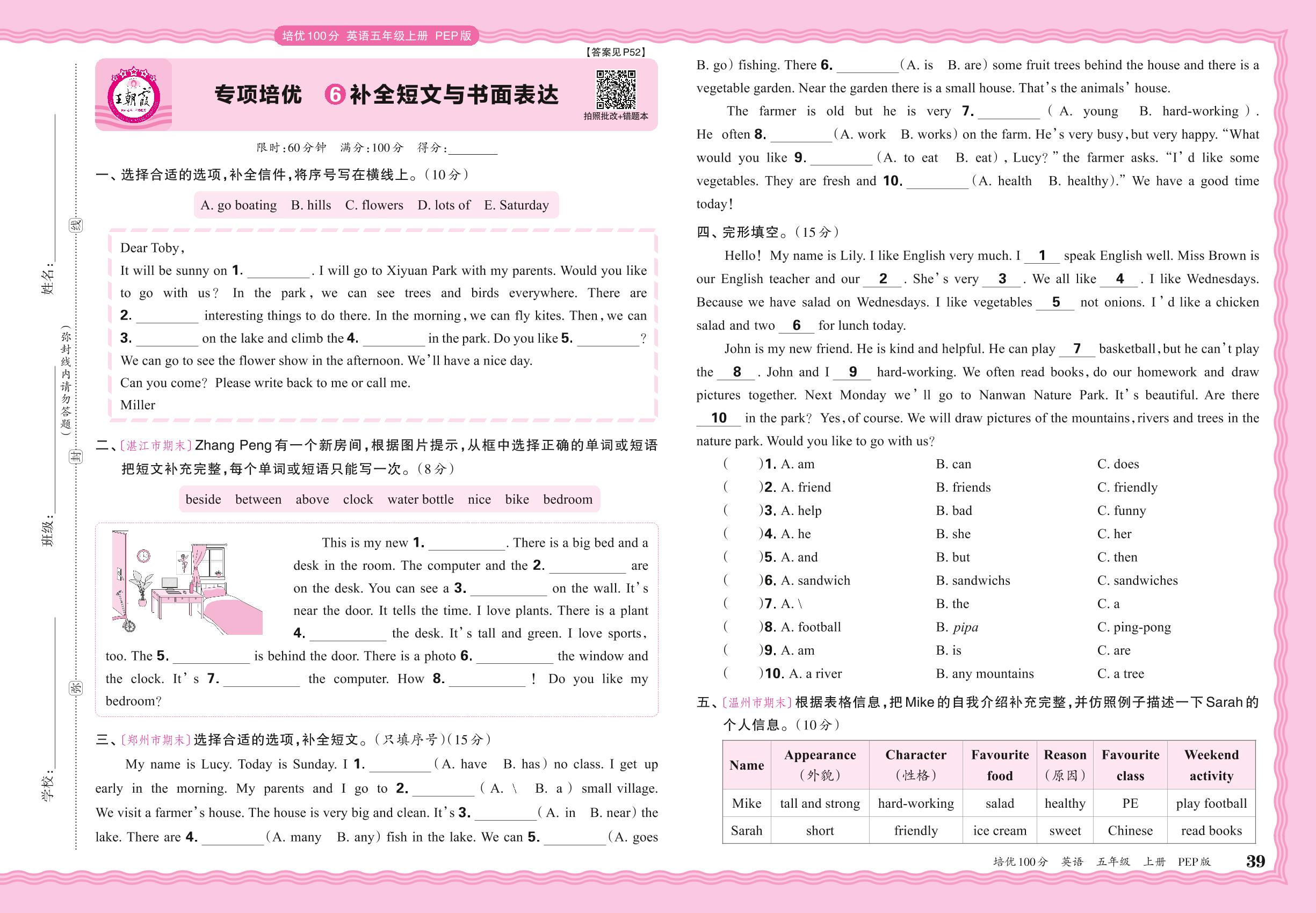 2024秋上册五年级英语人教PEP版(三起始) 期末专项卷PY版·补全短文与书面表达【6】