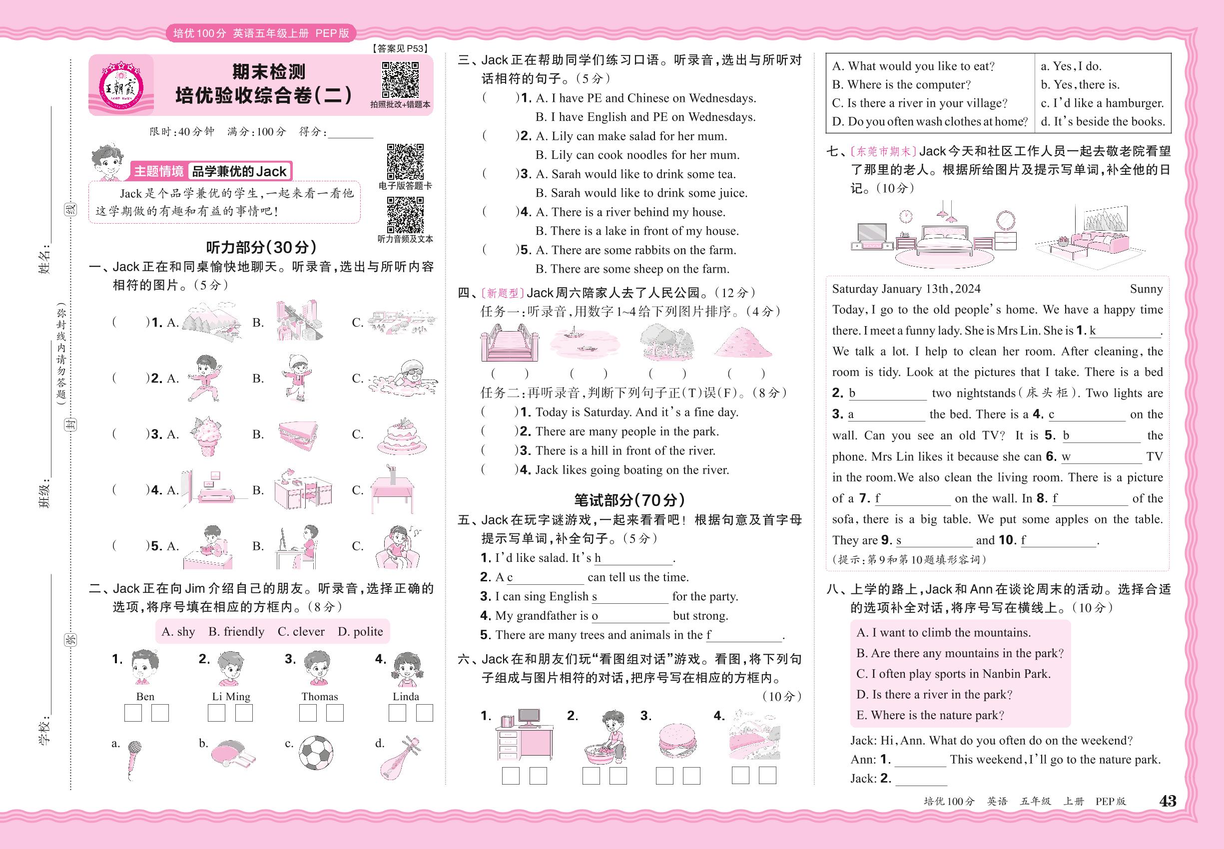 2024秋上册五年级英语人教PEP版(三起始) 期末检测 培优验收综合卷(二)