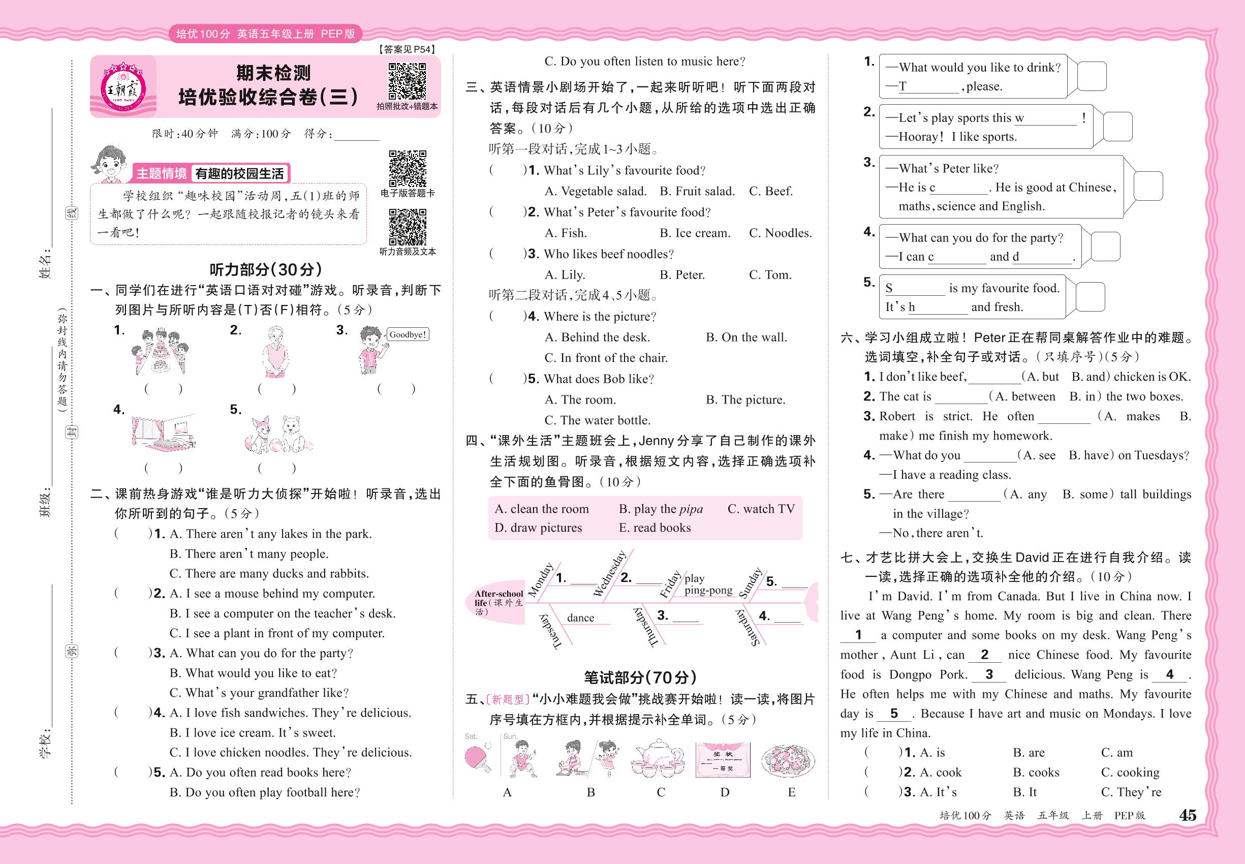2024秋上册五年级英语人教PEP版(三起始) 期末检测 培优验收综合卷(三)