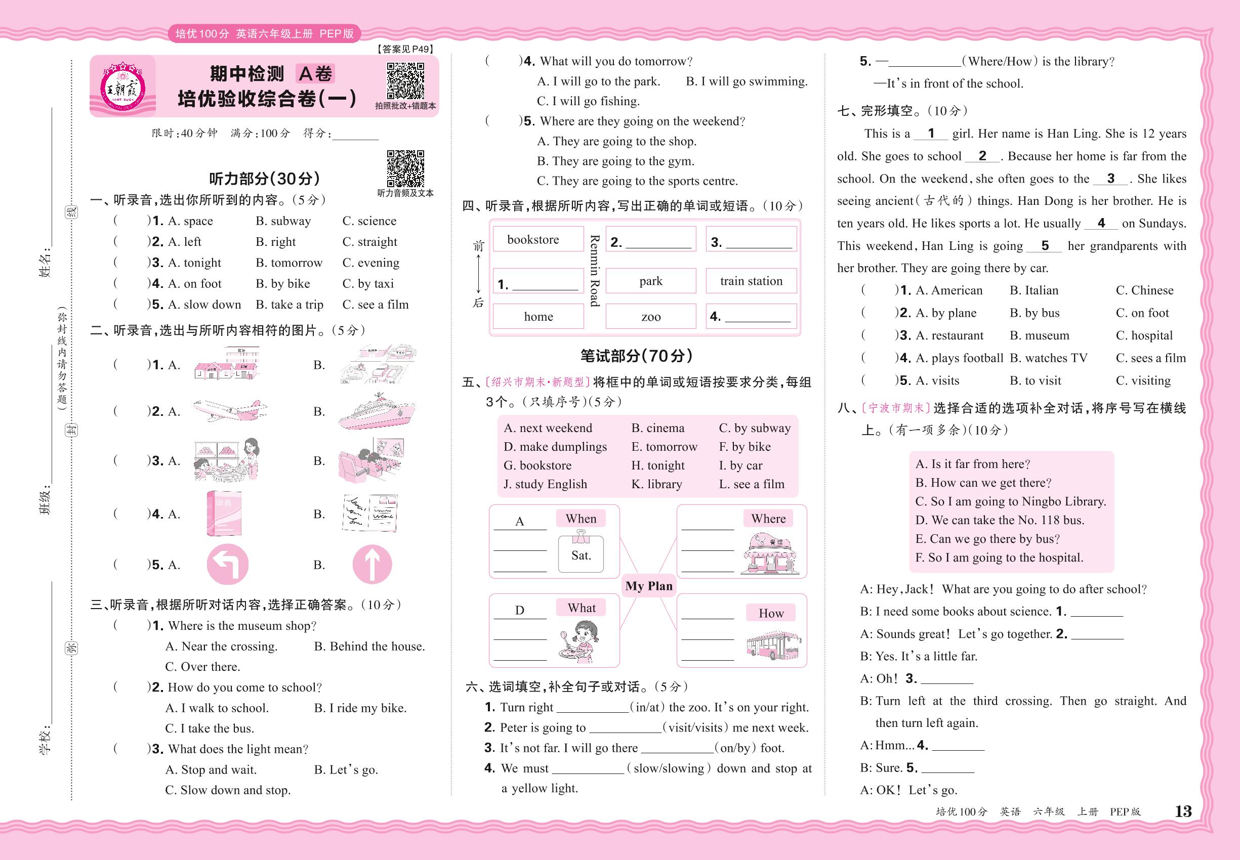 2024秋上册六年级英语人教PEP版(三起始) 期中检测A卷 培优验收综合卷(一)