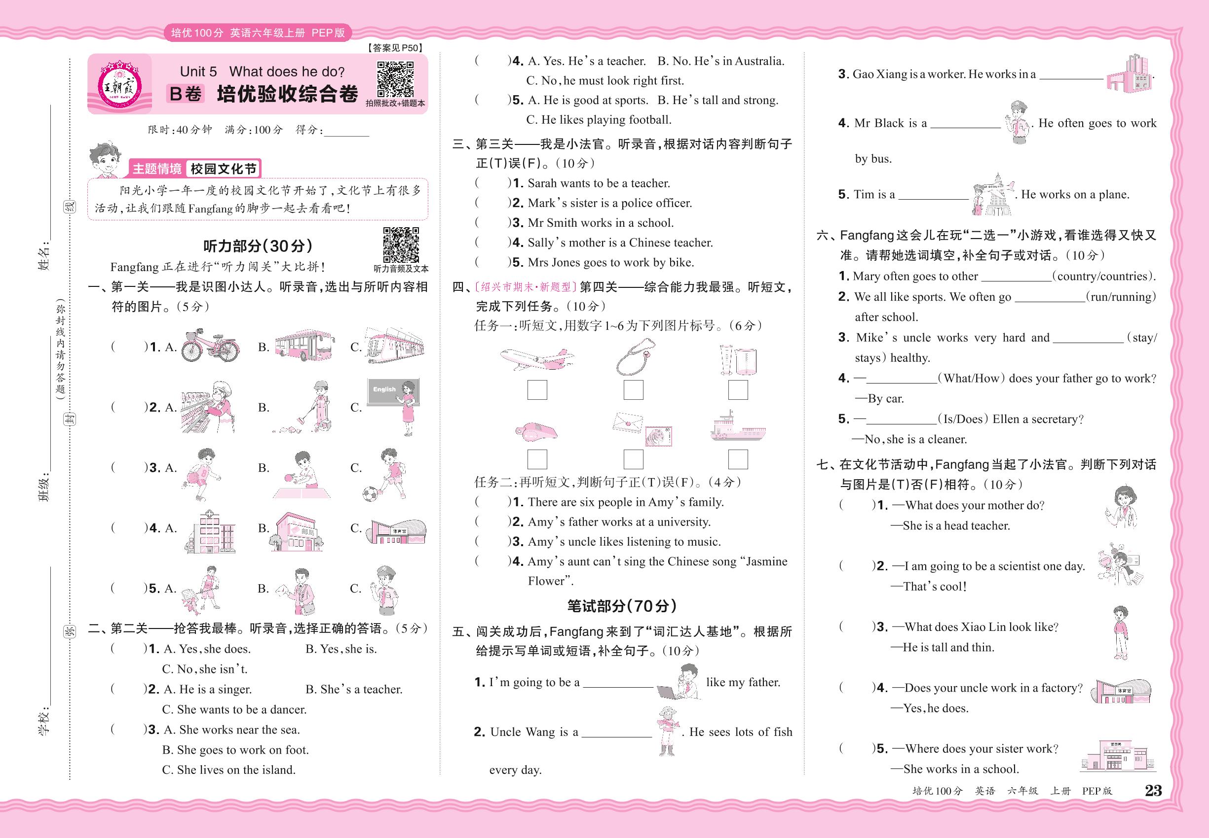 2024秋上册六年级英语人教PEP版(三起始) Unit 5 B卷 培优验收综合卷
