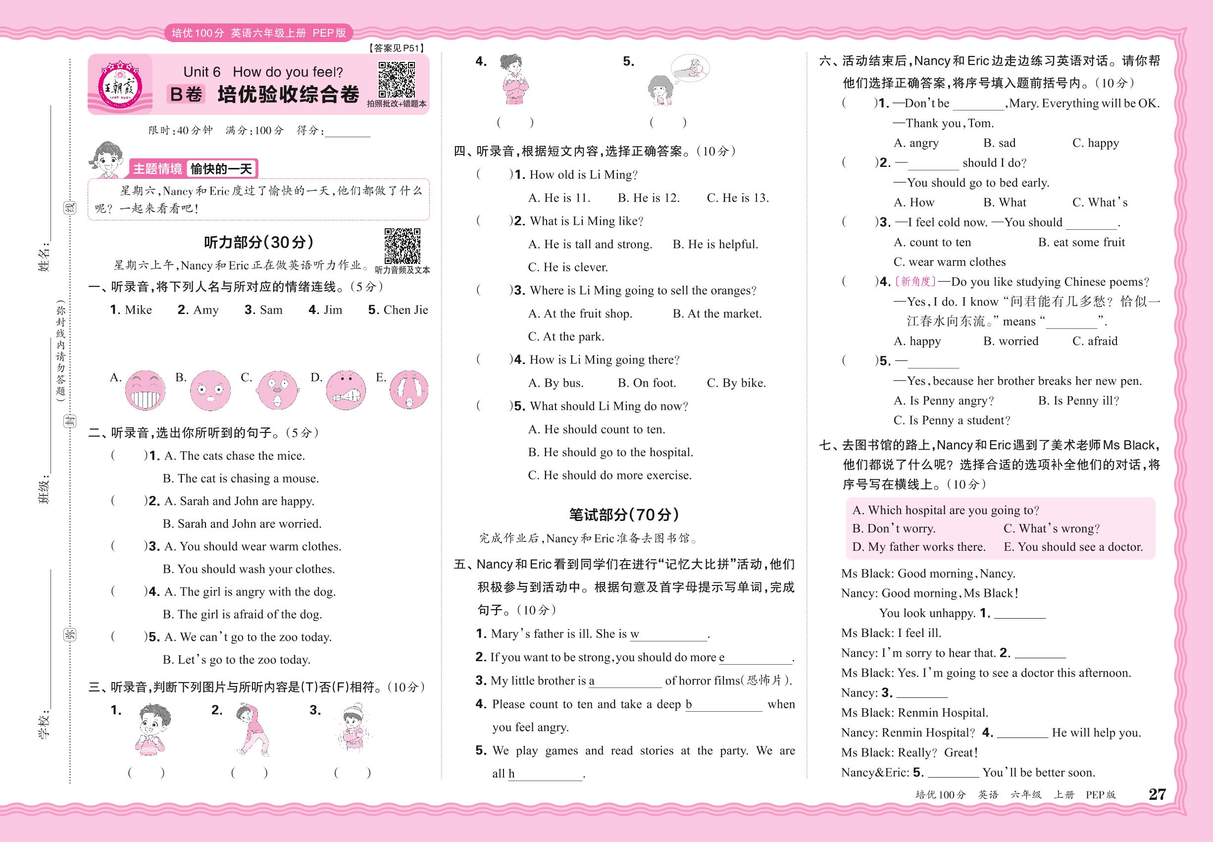 2024秋上册六年级英语人教PEP版(三起始) Unit 6 B卷 培优验收综合卷
