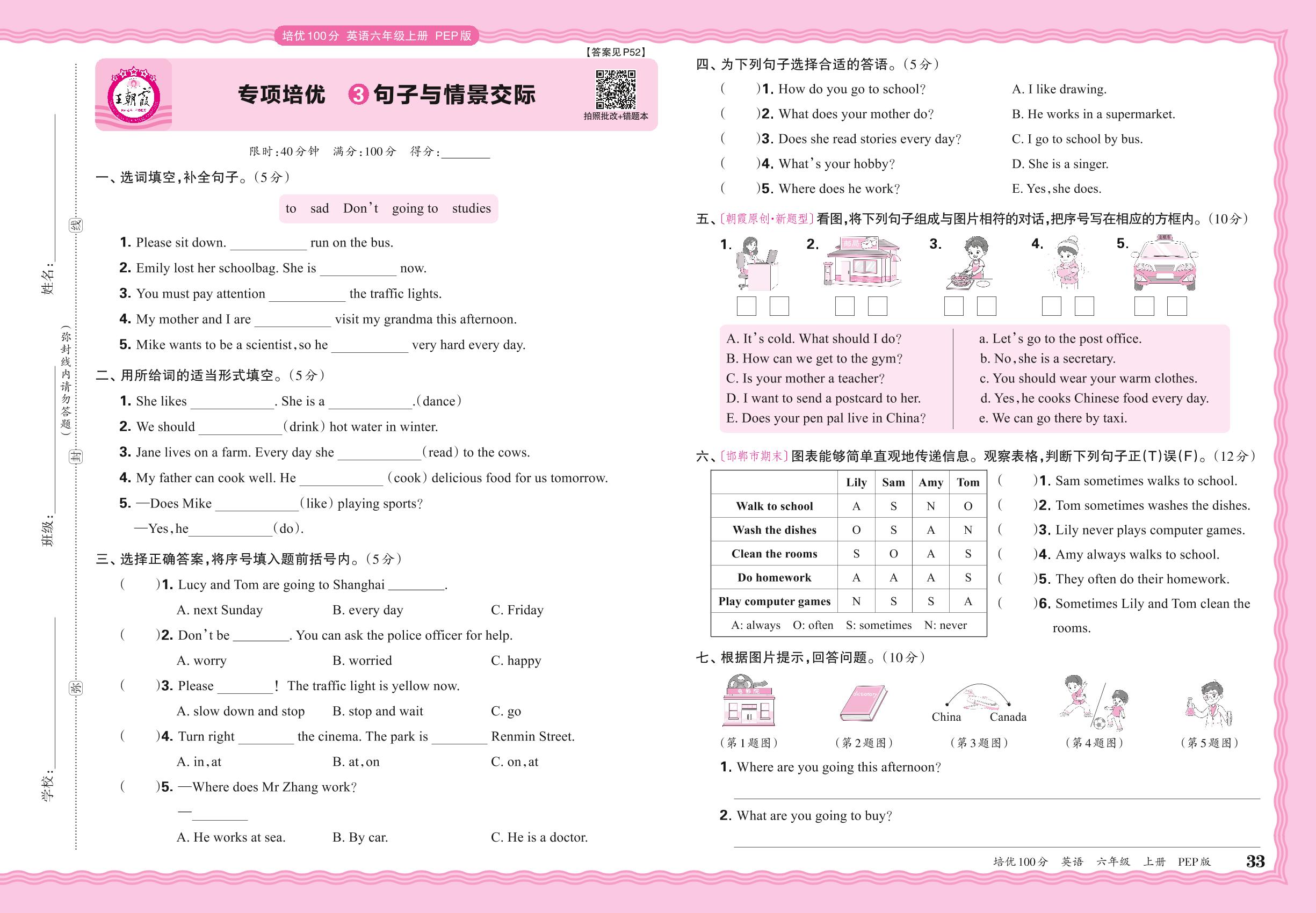 2024秋上册六年级英语人教PEP版(三起始) 期末专项卷PY版·句子与情景交际【3】