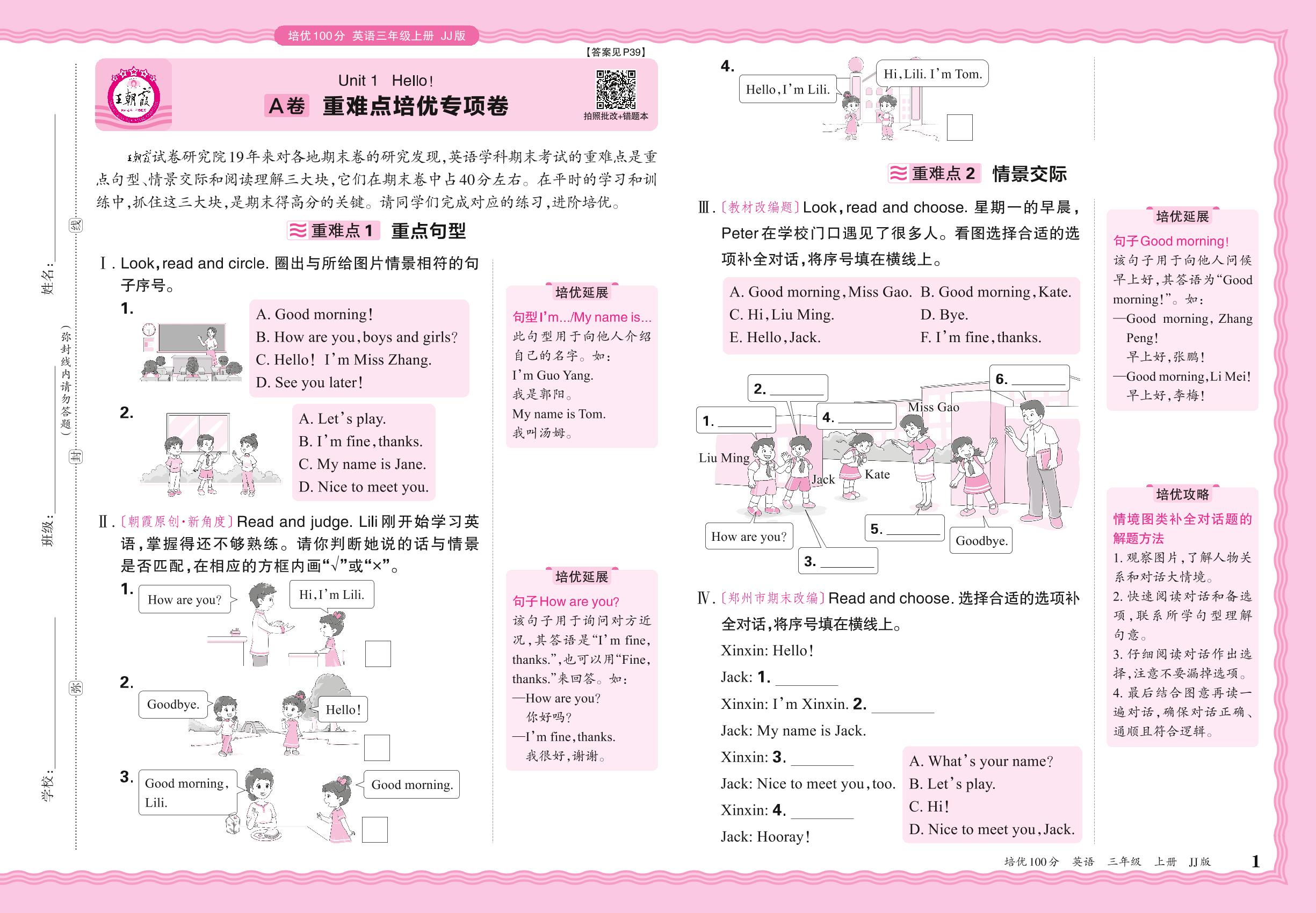 2024秋上册三年级英语冀教版 Unit 1 A卷 重难点培优专项卷