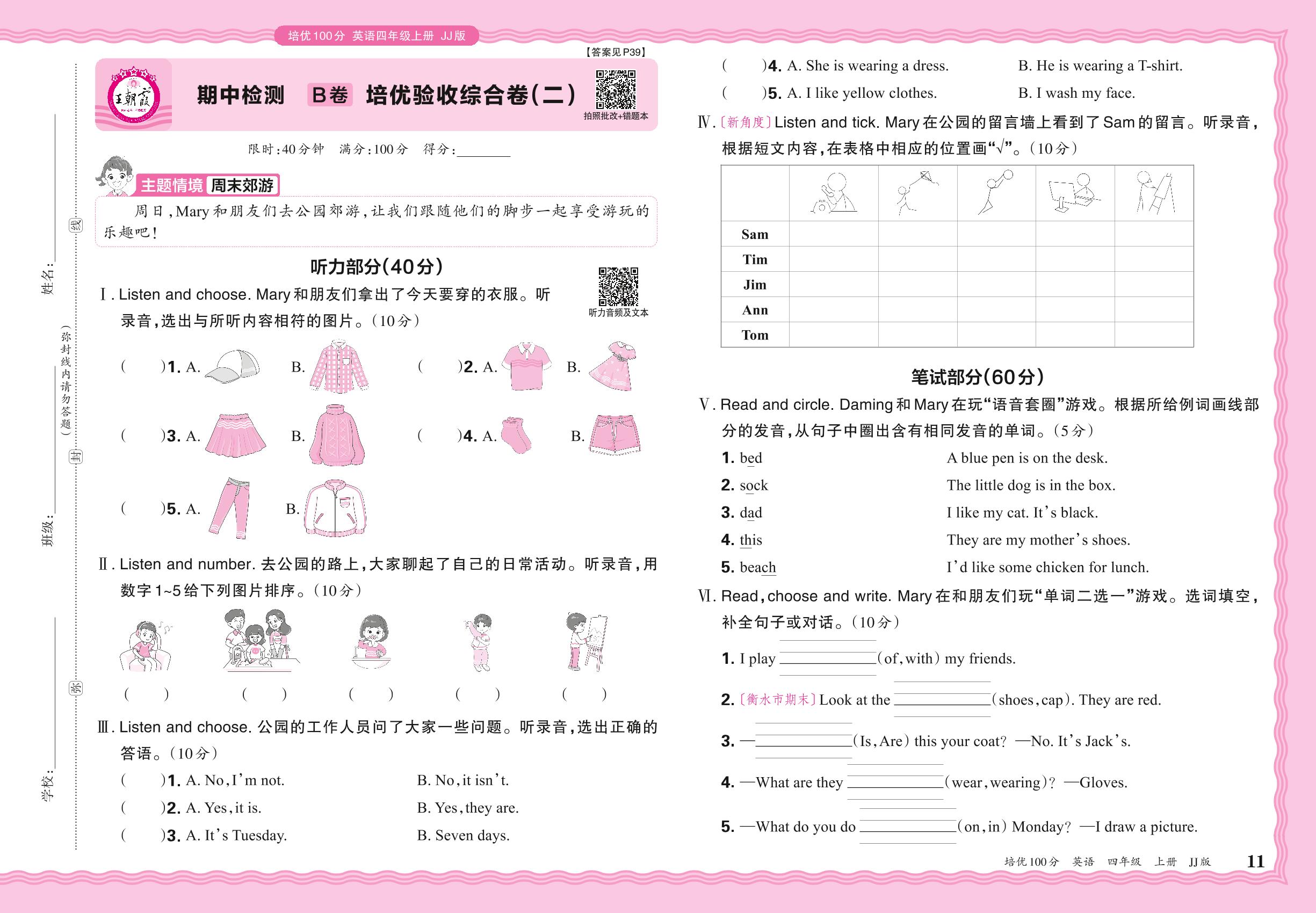 2024秋上册四年级英语冀教版 期中检测B卷 培优验收综合卷(二)