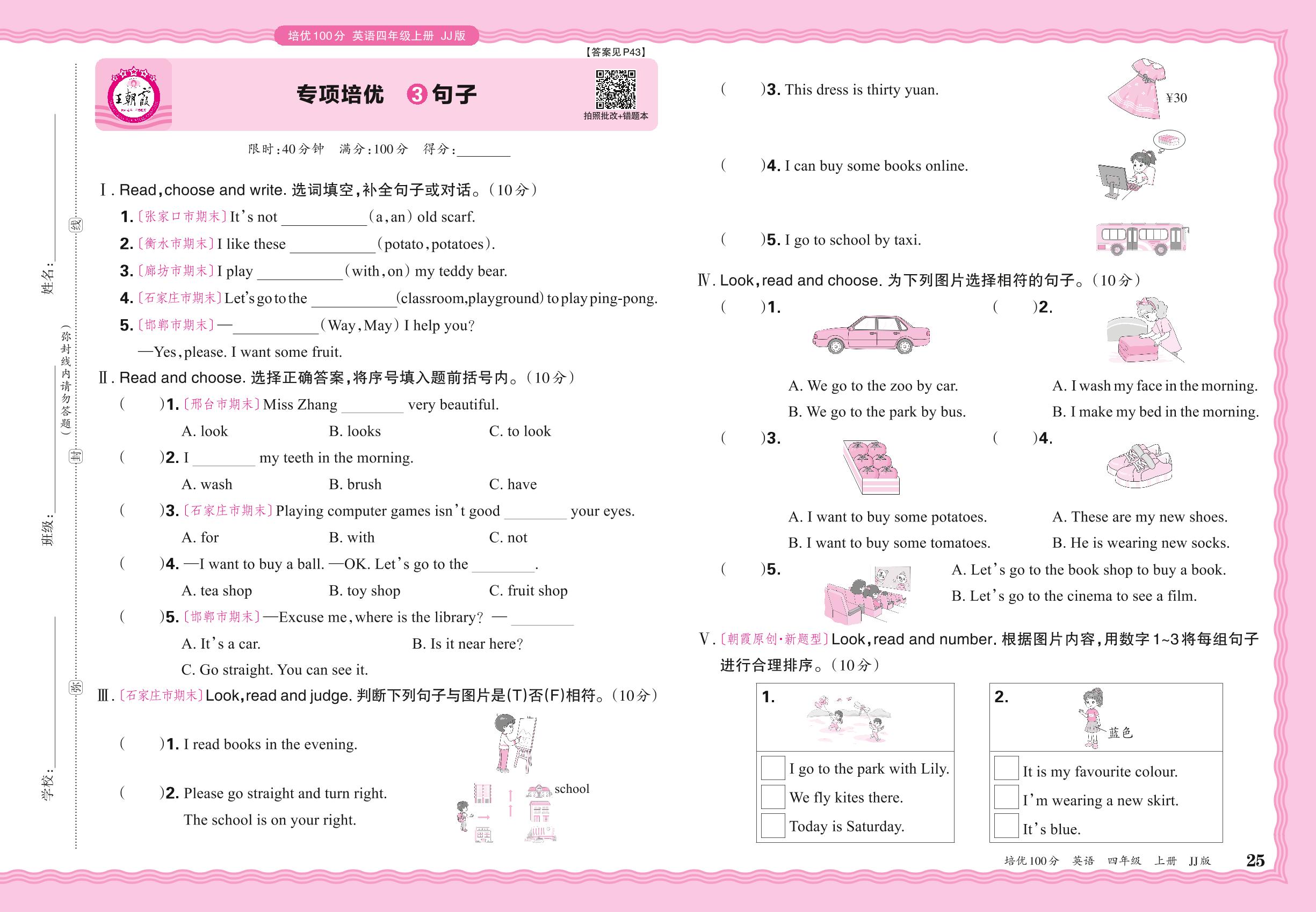 2024秋上册四年级英语冀教版 期末专项卷PY版·句子【3】