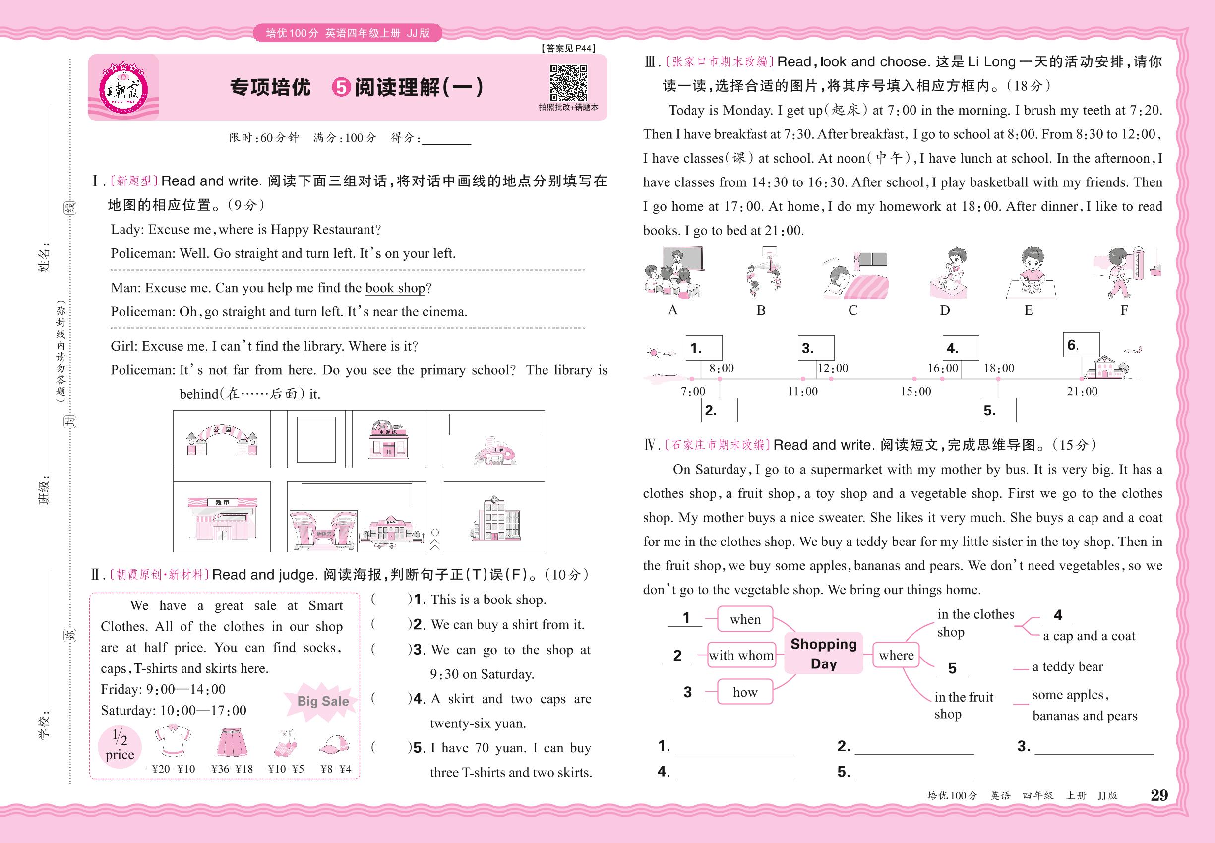 2024秋上册四年级英语冀教版 期末专项卷PY版·阅读理解(一)【5】